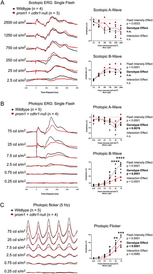 Fig. 5. Averaged scotopic single-flash recordings, photopic single-flash recordings, and photopic 5 Hz flicker recordings from wild-type and cdhr1-null F3 animals. (A) Averaged scotopic single-flash recordings from wild-type (n=8) and cdhr1-null animals (n=8). (B) Averaged photopic single-flash recordings from wild-type (n=10) and cdhr1-null animals (n=10). (C) Averaged photopic 5 Hz flicker recordings from wild-type (n=10) and cdhr1-null animals (n=10). Waterfall plots (left) and transformed linear regression curves (right) were used to visualize and compare wild-type and cdhr1-null A-wave and B-wave responses. The large positive A-wave values at 75 cd s/m2 (photopic single-flash recordings) were likely an artifact introduced by the large early receptor potential response measured by the electrode used in this experiment. Data analysis utilized a two-way ANOVA with Sidak's post hoc test. Data are plotted as mean±s.e.m. From one replicate. |