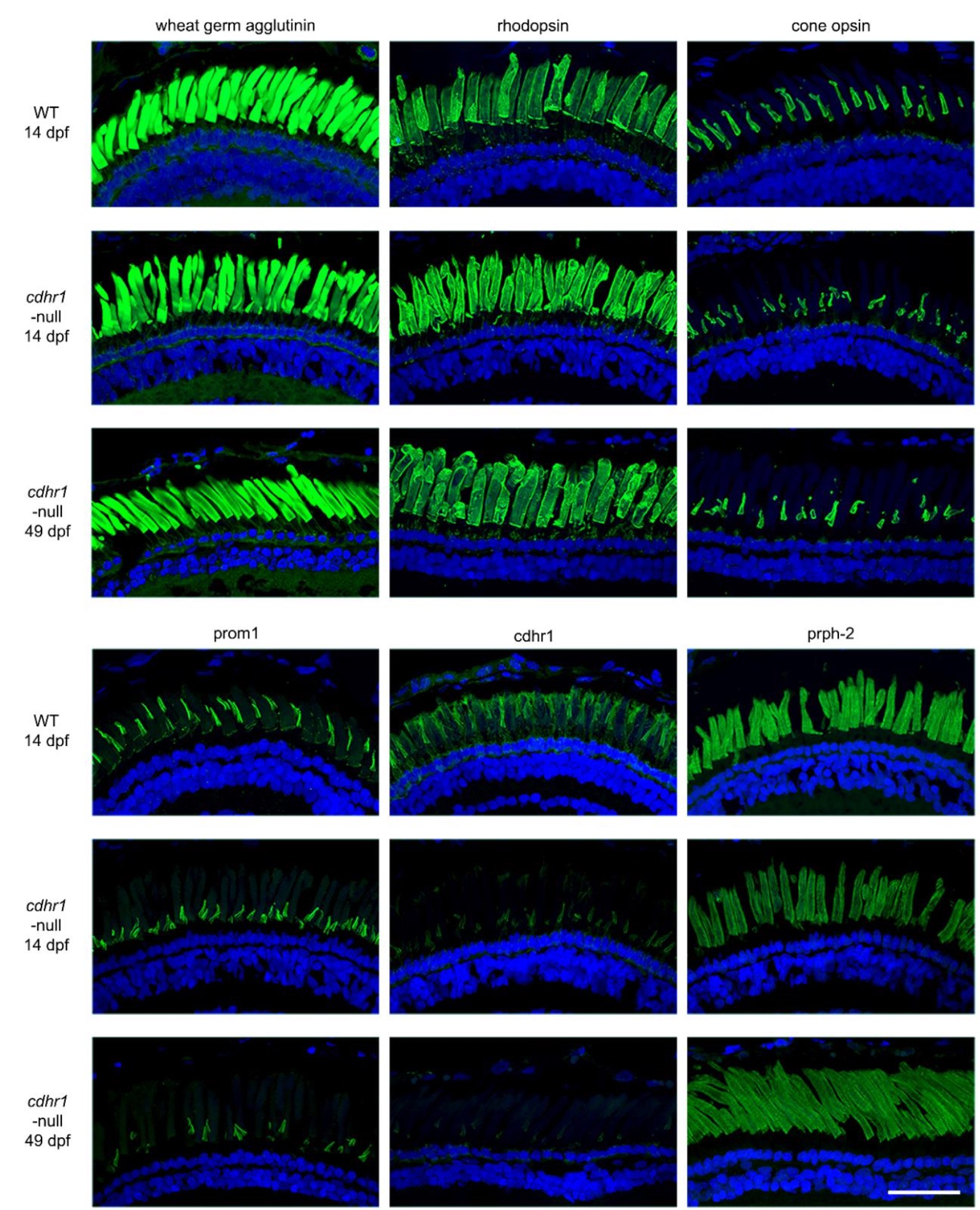 Figure S4. Immunolabelling of photoreceptor outer segment proteins in wildtype (14 dpf, top; n = 10) and F3 cdhr1-null (14 dpf, middle, n = 11; 42-43 dpf, bottom, n = 7) retinas. There was no mislocalization of any protein surveyed into the inner segment of the photoreceptors. Five replicates. Channels: green = protein of interest, blue = Hoechst. Scale bar = 50 μm. Abbreviations: dpf = days post-fertilization, prph-2 = peripherin-2, WT = wildtype. |
