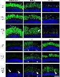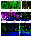 Figure S2. Immunolabelling of various photoreceptor outer segment proteins in wildtype (14 dpf, top, n = 18) and F0 prom1-null (14 dpf, middle, n = 26; 42-43 dpf, bottom, n = 26) retinas. There was no mislocalization of any protein surveyed into the inner segment of the photoreceptors, with the exception of some rare instances of mislocalization of cone opsin to the inner segment (see Fig. 1). As animals aged, there was an increase in Hoechst-stained and autofluorescent deposits in the outer segment layer (white arrowheads). Seven replicates. Channels: green = protein of interest, blue = Hoechst. Abbreviations: OpS = optical section (centre of stack). Scale bar = 50 μm. |