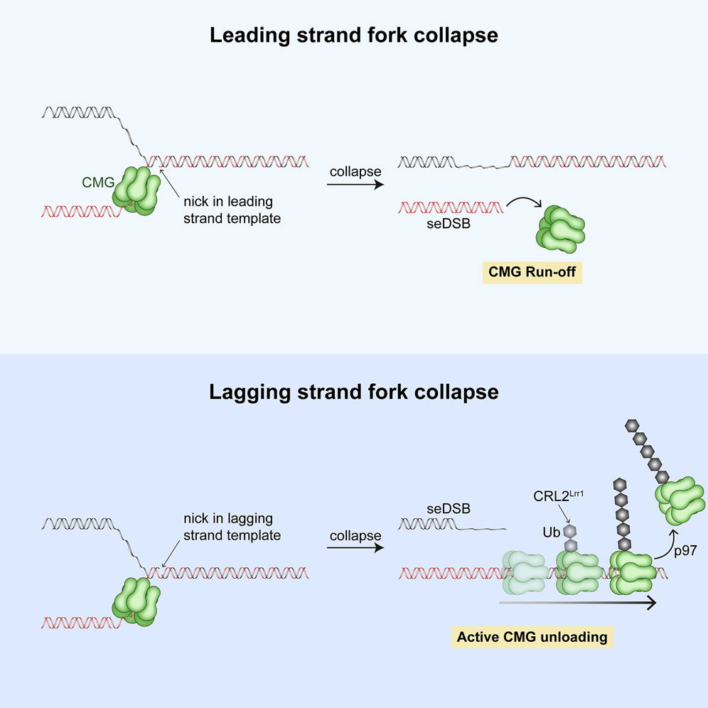 DNA damage impedes replication fork progression and threatens genome stability. Upon encounter with most DNA adducts, the replicative CMG helicase (CDC45-MCM2-7-GINS) stalls or uncouples from the point of synthesis, yet eventually resumes replication. However, little is known about the effect on replication of single-strand breaks or "nicks," which are abundant in mammalian cells. Using Xenopus egg extracts, we reveal that CMG collision with a nick in the leading strand template generates a blunt-ended double-strand break (DSB). Moreover, CMG, which encircles the leading strand template, "runs off" the end of the DSB. In contrast, CMG collision with a lagging strand nick generates a broken end with a single-stranded overhang. In this setting, CMG translocates along double-stranded DNA beyond the break and is then ubiquitylated and removed from chromatin by the same pathway used during replication termination. Our results show that nicks are uniquely dangerous DNA lesions that invariably cause replisome disassembly, and they suggest that CMG cannot be stored on dsDNA while cells resolve replication stress.