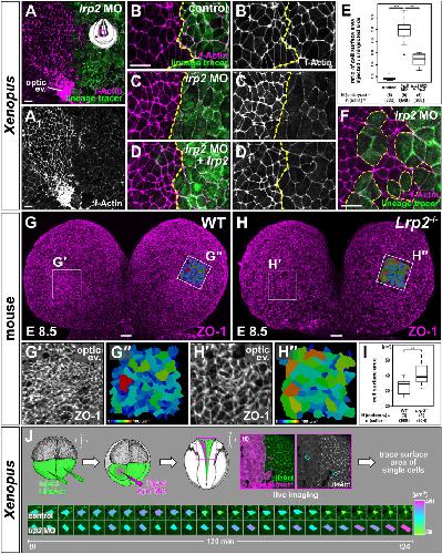 Fig. 3. Lrp2 is cell-autonomously required for efficient apical constriction. Apical constriction (AC) in forebrain neural plate (NP) cells. (A,A1) F-actin revealed a larger apical cell surface in lrp2 morpholino oligomer (MO)-injected cells (identified by lineage tracer fluorescence) compared with the uninjected side; there was a lack of AC in the optic evagination (ev.) area on the injected side. (B-E) Quantification of cell surface areas in unilaterally injected lineage tracer-only controls (B,B1), lrp2 morphants (C,C1) and morphants with re-introduced lrp2 (D,D1). (E) Cell surface area ratios calculated between injected and uninjected sides; box plot and Wilcoxon rank sum test. (F) The intermingling of constricting NP cells with lrp2 morphant cells demonstrates cell autonomy of AC failure. (G,H) Frontal views of the forebrain area of wild-type (WT; G) and Lrp2â/â (H) 7-somite stage mouse embryos at E8.5; ZO-1 delineates cell borders. (Gâ²,Hâ²) Magnification of optic evagination area, indicated in G,H; cell surface area was increased in mutants. (Gâ³,Hâ³) Color-coded maps (areas indicated in G,H) visualize cell surface area. (I) Graphical representation of results from Gâ³,Hâ³; four areas from each embryo were analyzed; box plot and Student's t-test. (J) Live imaging (Movie 2) using LifeAct indicates a failure of AC in morphant cells, despite actin dynamics. Cell surface area measurements revealed size fluctuations; final AC occured in control cells only. Scale bars: 25â µm in A-D,F; 20â µm in G,H. |