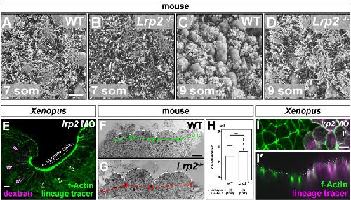 Fig. 4. No efficient remodeling of the apical surface in cells with apical constriction failure. (A-D) Scanning electron micrographs of mouse neuroepithelial cells at E8.5. Prominent filamentous, microvilli-like protrusions were present on wild-type (WT; A) and LRP2-deficient (Lrp2â/â; B) cells at the 7-somite (som) stage. Reduced filamentous protrusions are seen at the 9-somite stage in the wild type (C), but are persistent in Lrp2â/â (D). (E) Transverse section of Xenopus forebrain area at stage 19; lrp2 morpholino oligomer (MO)-positive cells are identified by their enlarged apical surface and by cytosolic lineage tracer fluorescence. Embryos were incubated in fluorescent dextran from stages 14 to 19. Signal is present in constricted cells (filled arrowheads) but absent from MO-targeted cells (empty arrowheads). F-actin staining indicates cell borders. (F,G) Transmission electron micrographs of E9.5 coronal ultrathin sections. Normal apical cell diameters (green lines) and moderate bulging are present in the wild type (F); increased cell diameter (red lines) and excessive bulging are found in Lrp2â/â cells (G). (H) Quantification and statistical analysis of cell diameters. Student's t-test. Data are mean±s.e.m. (I) En face view of neural plate showing apically enlarged lrp2 MO-targeted cells (lineage tracer+) bulged outwards, see orthogonal view (Iâ²; optical section at level indicated in I). Scale bars: 2â µm in A-D; 20â µm in E; 2â µm in F,G; 10â µm in I. |