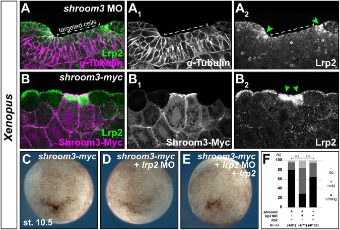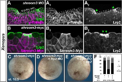 Fig. 6. lrp2 functionally interacts with shroom3 in mediating apical constriction. (A) Transverse section through neural plate; unilateral injection of shroom3 morpholino oligomer (MO) produces a failure of apical constriction (α-tubulin highlights wide cell surfaces; A1); apical Lrp2 accumulation in constricting hinge point cells (arrowheads in A2) and lack of apical Lrp2 recruitment in targeted cells. (B) Section through animal cap; ectopic apical constriction is induced in cells injected with shroom3-myc (detected by anti-Myc antibody; B1) coinciding with apical Lrp2 accumulation (arrowheads in B2). (C-E) shroom3-induced ectopic apical constriction in animal cap cells at stage (st.) 10.5 (C) is abrogated by co-injection of lrp2 MO (D) and restored by co-injection of lrp2. (F) Quantification and statistical analysis of experiments in C-E: no, mild or strong ectopic constriction are quantified. N=number of experiments; n=number of embryos, Ï2 test. |