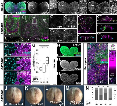 Fig. 7. Lrp2 mediates apical constriction by functional interaction with Gipc1. (A) Frontal view of wild-type (WT) mouse forebrain area at E8.5 (7 somites). Immunofluorescence (IF) staining reveals localization of GIPC1 and LRP2; ZO-1 marks cell borders. (A1-A3) Single channels. (A1â²-A3â³) Magnification of areas indicated in A1-A3; differential GIPC1 intensities exist between large and constricted cells. (B,C) Frontal views of stage (st.) 16 (B) and stage 15 (C) embryos; dashed line indicates the anterior limit of the neural plate; immunofluorescence reveals the spatially dynamic localization of Gipc1 (B) and spatially dynamic colocalization of Lrp2 and Gipc1 (C). (Bâ²) Single channel of Gipc1; higher magnification of the area indicated in B. Boxed areas indicated in C are shown at higher magnification in Câ²-Câ³â³. (Câ²1,Câ³1,Câ²2,Câ³2) Single channels. Gipc1 is present in areas with low (Câ²1,Câ²2) or high (Câ³1,Câ³2) amounts of Lrp2. Dispersed distribution of Lrp2 and Gipc1 in a cell with a large apical surface (Câ³â²), also visible in an orthogonal optical section (Câ´a; indicated in Câ´); sites of Lrp2/Gipc1 co-localization are indicated (white arrowheads). (Câ³â³) Cell with a constricted surface showing Gipc1 accumulation. (Câa,Câb) Colocalization (white arrowheads) or separate localization (green or magenta arrowheads) are indicated. Blue arrowheads indicate the level of circumferential actin; dashed line indicates apical surface in Câ³â²a,Câa,Câb. (D-F) Functional interaction of Lrp2 and Gipc1 demonstrated by individual (D,E) or combined (F) injection of low-dose lrp2/gipc1 morpholino oligomer (MO); targeted cells with lineage tracer (LT) fluorescence are shown. (G) Graphical representation of results from D-F; box plot and Wilcoxon rank sum test. (H) Frontal view of LRP2-deficient (Lrp2â/â) mouse forebrain area at E8.5 (seven somites). Immunofluorescence reveals localization of Gipc1; ZO-1 outlines cells. (H1,H2) Single channels. There is homogenous GIPC1 signal throughout the neuroepithelium. (I) Mislocalization of Gipc1 in lrp2 MO-injected cells in stage 16 embryos; the magnified forebrain area is marked by a box in the schematic. Targeted cells are identified by LT; dashed line delineates targeted/non-targeted areas. (I1) Without LT. (I1â²,I1â³) Higher magnification of single cells indicated by the boxes in I1; Gipc1 increases in hindbrain and decreases in the forebrain area. (J-M) Embryos for CRISPR/Cas9 experiments selected at the one-cell stage and incubated until uninjected controls (J) reached stage 18/19. (K) Injection of Cas9 ribonucleic particles (CRNP) containing sgRNA1. (L,M) Co-injection of CRNP together with the lrp2 construct (L) or with lrp2 ÎPBD (M). (N) Graphical representation of results from J-M, Ï2 test. Cell borders in D-F,I are visualized using F-actin staining. Scale bars: 50â µm in A,C,H,I; 100â µm in B; 20â µm in D-F. |