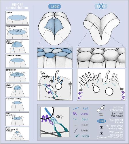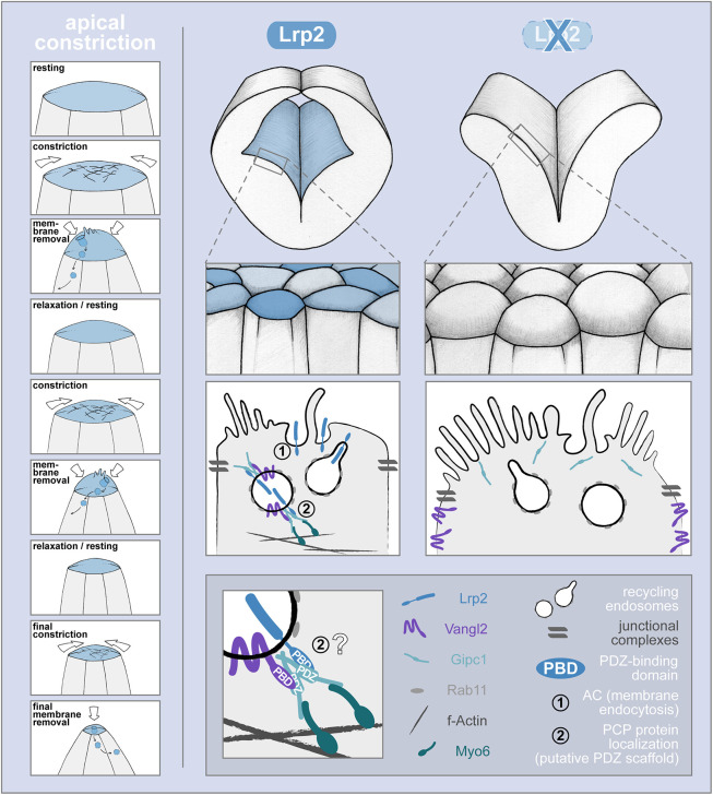 Fig. 8. Hypothetical model of Lrp2 functional interactions in neural tube closure. Apical constriction is seen as a stepwise process with repetitive modules of actomyosin-mediated constriction and Lrp2-mediated membrane removal (left column). Apical constriction of Lrp2-positive neuroepithelial cells facilitates neural tube closure (middle column). Lrp2 mediates endocytic removal of apical membrane (1) as well as correct temporospatial localization of Vangl2 (2) via recycling endosomes. The Lrp2/Vangl2 interaction is likely facilitated by PDZ/PBD-mediated intracellular scaffolding via dimerized Gipc1, connecting to Myo6 and the actin cytoskeleton. Lack of Lrp2 (right column) entails defective neural tube closure due to impaired apical constriction. Removal of apical membrane fails and proper subcellular sorting of Vangl2 and Gipc1 is disturbed, leading to their mislocalization. |