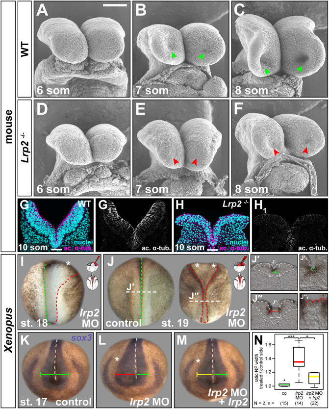 Fig. 2. Lrp2 is required for proper neuroepithelial morphogenesis and neural tube closure. Neural plate (NP) morphology. (A-F) Scanning electron micrographs of neural folds (NFs) from E8.5 wild-type (WT) and Lrp2â/â mouse embryos at the 6-, 7- and 8-somite (som) stages (st.), frontal views. (A-C) Wild-type NFs are progressively elevated and optic evagination is initiated (arrowheads in B,C). (D-F) Narrower NFs have delayed elevation and there is impaired optic evagination in mutants (arrowheads in E,F). (G,H) Immunofluorescence staining detecting acetylated α-tubulin (ac. α-tub.) and DAPI-stained nuclei on coronal sections of 10-somite wild-type and Lrp2â/â mouse NFs. Scale bars: 100â µm in A-F; 50â µm in G,H. (I,J) Dotted lines indicate normal (green) and abnormal (red) positioning of the border between neural and non-neural ectoderm. (I) Morpholino oligomer targeting lrp2.L (lrp2 MO) injected as indicated. Impaired hingepoint formation and NF convergence on the injected side are indicated (asterisk). (J) Closely apposed NFs in control at stage 19. Open anterior and posterior NFs, and a short anteroposterior axis are formed upon bilateral injection (asterisks); embryos were photographed at the same magnification. (Jâ²,Jâ³,Jâ²1,Jâ³1) Transverse sections and magnifications thereof; levels are as indicated in J. Green markers indicate normal floor plate width (Jâ²) and apical cell surfaces (Jâ²1); red markers indicate wide floor plate (Jâ³) and abnormally wide apical cell surfaces (Jâ³1). (K-M) In situ hybridization for sox3; normal NP width (green bar) is found in control (K); lrp2 MO-impaired NP narrowing (red bar, L) was partially rescued (yellow bar) by re-introduction of lrp2 (M). (N) Graphical representation of results from K-M (box plot, Wilcoxon rank sum test). |