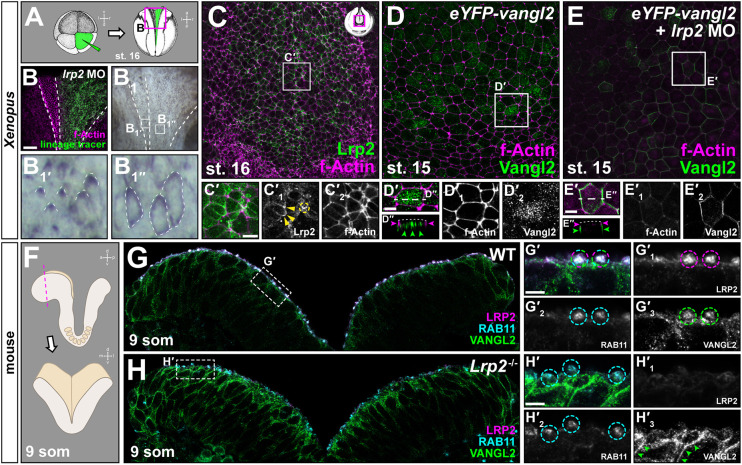 Fig. 1. Lrp2 is expressed in the neuroepithelium and increased in constricting cells. (A-D) lrp2 mRNA (A) and protein (B-D) expression analyzed by in situ hybridization and immunofluorescence, respectively. Neurula stage (st.) embryos (frontal views, dorsal upwards). (A) Neural lrp2 expression. (B) Stage 15 forebrain region; Lrp2 is expressed in most cells (outlined by F-actin); single cells with high Lrp2 levels are located along the anterior rim of neural folds (NFs; arrowheads). (Bâ²) Magnification of boxed region in B; increased Lrp2 levels are found in cells with small apical surface (circled in single channels Bâ²1 and Bâ²2). (C) LRP2 is detected throughout E8.5 anterior NFs, concentrated in areas undergoing apical constriction. Compare Câ² (constricted cells in optic evagination) with Câ³ (dorsolateral cells with larger cell surface). ZO-1 marks cell boundaries. (D) STED imaging; LRP2 is condensed around neuroepithelial primary cilia (ARL13b+) at E9.5. Scale bars: 10â µm in Bâ²,Câ²,Câ³; 1â µm in D. |