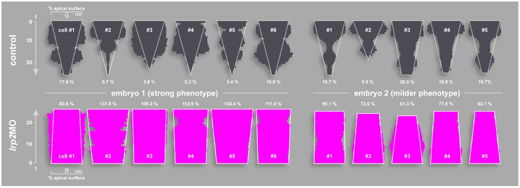 Fig. S3: Cell surface area fluctuation during apical constriction. Temporal development of the surface area of individual cells from two independent live-imaged embryos was plotted. Every horizontal bar represents the measurement at one time point (t) of a cell from either the uninjected control side (dark grey) or from the side injected with lrp2MO (identified by lineage tracer fluorescence; magenta). Wherever possible, up to 25 time points representing 120 min of live imaging were measured. For each cell, the cell surface size at t0 was set to 100 % and the relative cell size at the end of the time series is shown. Note that the change in surface area is not continuous and linear (linear development indicated by white rectangles / triangles), but that surface area decreases and increases multiple times before finalizing apical constriction. These fluctuations are pronounced in control cells, but also present in lrp2MOinjected cells. |