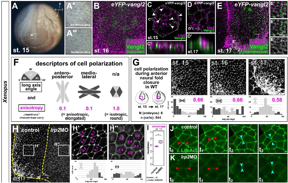 Fig. S4: Dynamic planar cell polarity in the Xenopus neural plate. (A) Brightfield image; frontal view of a stage (st.) 15 embryo, note asymmetric pigment accumulation in anterior (a) aspect of cells (outlined by dashed line) in the hindbrain area (arrowheads in Aâ) compared to symmetric circumferential distribution in forebrain area cells (Aââ). (B-D) eYFP-vangl2 was injected into A1-lineage in 4-8-cell embryos and detected using indirect immunofluorescence (IF) for GFP, f-Actin visualizes cell borders. eYFP-Vangl2 localized in dotted, vesicle-like pattern up to st. 16 (B; 6 embryos, st. 14-16). (C) Single forebrain area cell at st. 15, IF demonstrating overlap of Vangl2 and Lrp2 in several spots throughout the cell. (Câ) Optical section, level indicated in (C), colored circles indicate overlap. (D) Group of forebrain area cells at st. 17; Vangl2 at membrane, Lrp2 mostly cytoplasmic. (Dâ) Optical section, level indicated in (D), colored circles indicate (non-)overlap. (E) Re-distribution to (asymmetric) membrane localization from st. 17 onwards (arrowheads in E and Eâ indicate Vangl2 asymmetry; 8 embryos, st. 17 / 18). Magnified area (Eâ) as indicated in (E); (Eâ1, 2) single channels shown in grayscale. (F) Schematic, describing two aspects of cell polarization - orientation of the long axis of a polarized cell and cell anisotropy. The long axis of a cell can be oriented in anteroposterior (AP; angles 45.1-135Ë, light grey) or mediolateral (ML; angles 0-45 and 135.1- 180Ë, dark grey) direction. Cells featuring a long axis are anisotropic, with a âroundnessâ of 0.1 representing a narrow, elongated cell. At 1.0, cells are isotropic and consequentially do not feature a long axis. (G) Assessment of cell polarization during anterior neural fold narrowing in wildtype (WT) embryos from st. 15 to 17. Throughout this time window, cells are anisotropic (magenta numbers), but shift their planar orientation from ML (st. 15) via random (st. 16) to AP (st. 17). (H) Unilateral injection of lrp2MO into the A1-lineage of 8-cell embryos, cell polarity analysis at st. 17. Note anisotropic, AP-oriented cells in control (Hâ) and more isotropic cells with randomly oriented long axes upon loss of lrp2 (Hââ). (I) Graphical representation of reduced anisotropy upon loss of lrp2; Wilcoxon rank sum test, *= â¤0.05. (J, K) Stills from movies of embryos injected with LifeAct at 4-8-cells, T1-transitions between two pairs of cells are visualized over four time points (t). Red arrowheads: shortening cell junction in ML orientation; blue arrowheads: lengthening cell junction in AP orientation. l: left, p: posterior, r: right. |