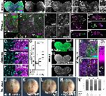 Fig. S1: Lrp2 expression and protein depletion by knock-down in Xenopus and knockout in mouse. (A) mRNA and protein expression profile of Xenopus lrp2.L (from Xenbase.org). (B) Xenopus lrp2 expressed in brain (arrowheads), eye anlage, otic vesicle (ov) and proximal pronephros (pn) in stage (st.) 25 tailbud embryo. (C) Morpholino oligomer (MO) decreases Lrp2 expression in injected cells; single channel (C1) for clarity. (D, E) Frontal views of anterior neural folds of wild type (WT; D) and Lrp2-/- (E) mouse embryos at embryonic day (E) 8.5. (D1, E1) WT LRP2 expression (D1) lost in Lrp2-/- (E1). ZO-1 labels cell boundaries. Scale bars (D, E): 50 μm. |