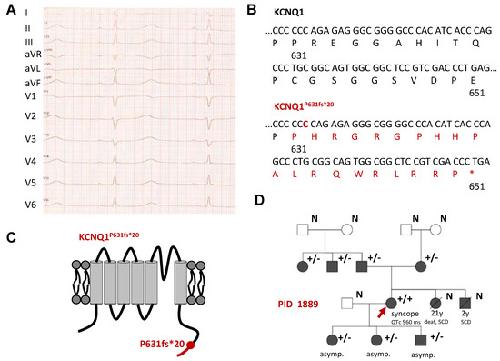 Figure 1. Identification of the homozygous KCNQ1P631fs*20 mutation in a patient with LQTS without hearing loss. (A) 12-lead ECG recording of the IP (PID1889) showing a QTc of 560 ms and a heart rate of 60 bpm under beta-blocker therapy. Paper speed was 50 mm/sec. (B) Partial nucleotide and amino acid sequence illustrated from amino acid 630 to 651 for KCNQ1WT (top) and the KCNQ1P631fs*20 variant (bottom). The cytidine insertion is highlighted in red as well as the novel amino acid sequence due to the frame shift. Please note that the mutated sequence shows a premature stop codon at amino acid position 651. (C) Cartoon showing the topology of the KCNQ1 channel α-subunit. The location of the mutation is indicated by a red circle and the resulting novel amino acid sequence due to the frameshift is provided in red. (D) Pedigree of the family of the IP (marked by a red arrow) with a KCNQ1P631fs*20 mutation as a result of a nucleotide insertion mutation (c.1892_1893insC). Filled symbols indicate patients and family members with a previous diagnosis of LQTS with or without symptoms. Squares and circles represent male and female subjects, respectively. In the top right of the symbol, genetic information is given: â+/ââ heterozygous mutation carrier, â+/+â homozygous mutation carrier, âNâ no genetic information was available. Below the symbols, information about certain symptomatic or further diseases are given. âSCDâ sudden cardiac death. In addition, the QTc is shown for the IP. If there are no symptoms, it was marked with âasymp.â. Symbols with a line through mark deceased subjects, and the age and cause of death is indicated below.
