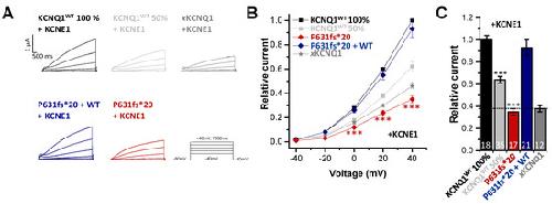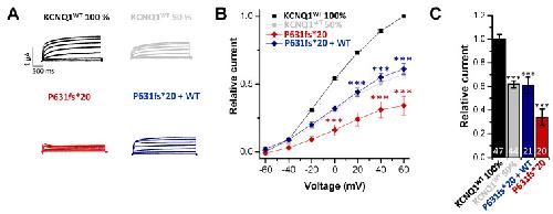 Figure 2. Functional effects of the KCNQ1P631fs*20 mutation. (A) Representative current traces of oocytes injected with KCNQ1WT 100% (14.5 ng/oocyte), KCNQ1P631fs*20 (14.5 ng/oocyte), KCNQ1WT 50% (7.25 ng/oocyte) or KCNQ1WT plus KCNQ1P631fs*20 (7.25 ng/oocyte each), respectively. Voltage was stepped from -60 to +60 mV in 20 mV steps lasting 3000 ms, from a holding potential of −80 mV. (B) Current voltage relationships obtained by blotting the current at the end of each voltage step for each voltage applied normalized to KCNQ1WT. In order to obtain the current-voltage relationship (I/V curve), all wild-type recordings were normalized to the value at +60 mV. The data of all the other constructs were also divided by the average current amplitude of the wild-type at +60 mV of the respective recording day. (C) Current amplitudes analyzed at +40 mV and normalized to KCNQ1WT (100%). All the data, also that of the wild-type recordings, were divided by the average current amplitude of the wild-type at +40 mV of the respective recording day. Numbers of oocytes recorded are indicated within the bar graphs. Values are expressed as means ± S.E.M. Error bars represent S.E.M. values. Significance was assessed using two tailed Student’s t-test. Asterisks indicate significance: ***, p < 0.001.