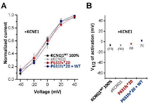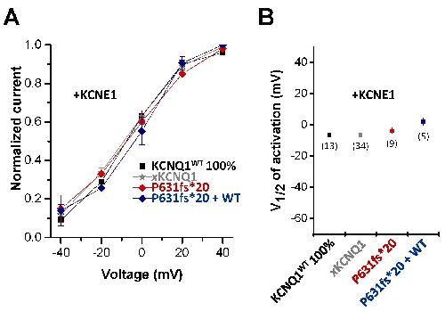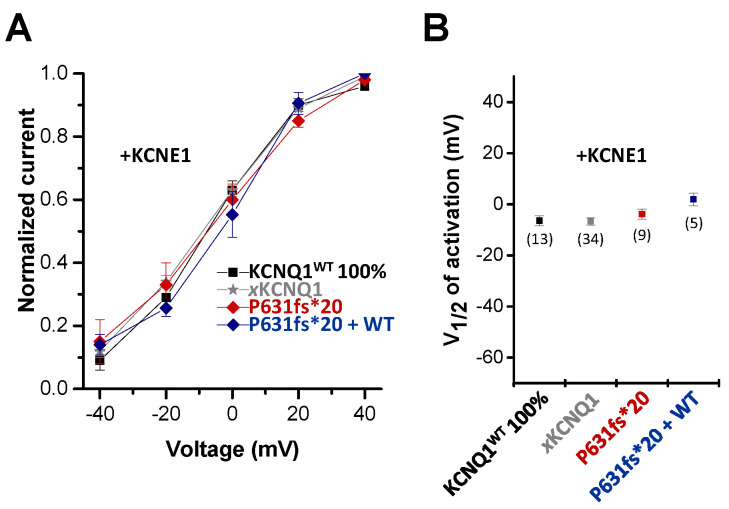Figure 4. Voltage-dependence of activation of the KCNQ1P631fs*20 mutant co-expressed with KCNE1. (A) Voltage-dependence of activation for KCNQ1+KCNE1, xKCNQ1+KCNE1, KCNQ1P631fs*20+KCNE1 and KCNQ1WT/KCNQ1P631fs*20+KCNE1. Recordings were performed with the protocol as described in Figure 3. The tail currents recorded after the 7000 ms pulse were normalized to the respective maximal tail current of each recording to obtain the conductance/voltage (G/V) curves. (B) Normalized tail currents were fitted to a Boltzmann function. The voltage of half-maximal activation (V½) of KCNQ1+KCNE1, xKCNQ1+KCNE1, KCNQ1P631fs*20+KCNE1 and KCNQ1WT/KCNQ1P631fs*20+KCNE1 are illustrated, together with the numbers of oocytes analyzed.