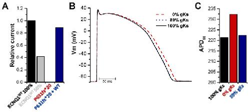 Figure 5. Action potential modelling with the homozygous or heterozygous KCNQ1P631fs*20 mutation in the IKs channel complex. (A) Mean current amplitudes of 100% KCNQ1WT injected together with KCNE1, 50% KCNQ1WT injected together with KCNE1, 100% KCNQ1P631fs*20 injected together with KCNE1 or 50% KCNQ1WT plus 50% KCNQ1P631fs*20 injected together with KCNE1. For all data, the endogenous xIKs current recorded by injection of KCNE1 alone was subtracted. Data were normalized to KCNQ1WT 100%. (B) Action potential simulations using the O’Hara-Rudy ventricular cell model. Conductivity of the IKs channel was set to 100% for wild-type (black), 0% for the homozygous (red, dashed line) and 89% for the heterozygous state (blue, dotted line) as calculated in (A). (C) APD at 90% repolarization (APD90) was evaluated for each configuration after the simulations achieved a steady state.