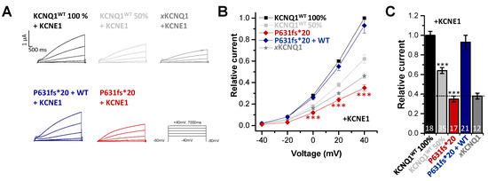 Figure 3. Functional effects of the KCNQ1P631fs*20 mutant co-expressed with KCNE1. (A) Representative current traces of oocytes injected with KCNQ1WT (8.1 ng/oocyte), KCNQ1P631fs*20 (8.1 ng/oocyte), KCNQ1WT 50% (4 ng/oocyte) or KCNQ1WT plus KCNQ1P631fs*20 (4 ng/oocyte each), all together with 0.1 ng KCNE1 cRNA or only KCNE1 cRNA (0.1 ng/oocyte), to obtain Xenopus (x)KCNQ1/KCNE1 (xIKs) channels. Voltage was stepped from -40 to +40 mV in 20 mV increments lasting 7000 ms, from a holding potential of â80 mV. (B) Current voltage relationships obtained by blotting the current at the end of each voltage step for each voltage applied normalized to KCNQ1WT plus KCNE1. In order to obtain the current-voltage relationship (I/V curve), all wild-type recordings were normalized to the value at +60 mV. The data of all the other constructs were also divided by the average current amplitude of the wild-type at +60 mV of the respective recording day. (C) Current amplitudes analyzed at +40 mV and normalized to KCNQ1WT plus KCNE1. All the data, also that of the wild-type recordings, were divided by the average current amplitude of the wild-type at +40 mV of the respective recording day. (AâC) All data are presented without subtraction of xKCNQ1 background currents. Numbers of oocytes recorded are indicated within the bar graphs. Values are expressed as means ± S.E.M. Error bars represent S.E.M. values. Significance was assessed using two tailed Studentâs t-test. Asterisks indicate significance: ***, p < 0.001.
