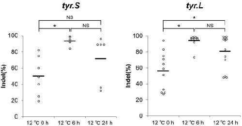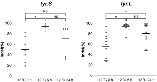 Fig. 2. Indel mutation rates of each knock-down embryo confirmed by analysis using the ICE algorithm. The graph shows the indel mutation percentage of samples (n = 6–13) that was successfully aligned with the control sequence obtained from a WT embryo in ICE analysis and its R-Squared was greater than 0.9. Bars indicate averages. ∗P < 0.01, NS (not significant), Tukey-Kramer test. Representative data of detected indel mutation patterns and distributions in the edited sample are shown in Supplementary Fig. S2.