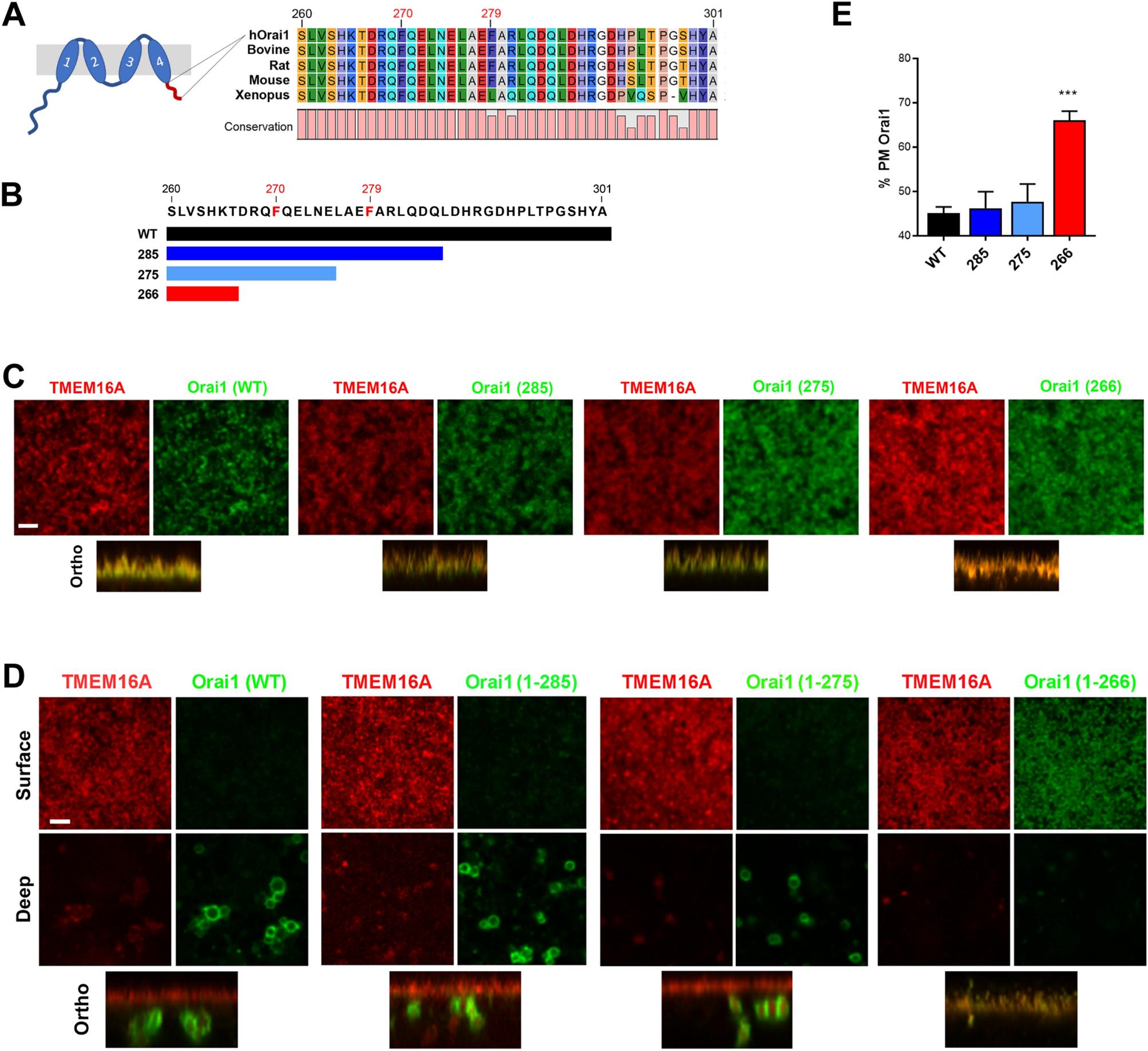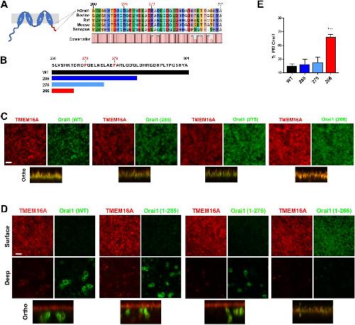 Figure 1. Internalization of Orai1 C-terminal truncations. (A) Cartoon of Orai1 with the C-terminus cytoplasmic domain highlighted (red) with its corresponding sequence alignment from various vertebrates. Human (NP_116179), bovine (NP_001092472), mouse (NP_780632), rat (NP_001014004), Xenopus (Q5EAU0). (B) Representation of the different Orai1 C-terminal deletions. (C, D) Confocal images and orthogonal sections from Xenopus oocytes (C) and eggs (D) expressing TMEM16A-mCherry with GFP-tagged Orai1 wild-type (WT) or the different deletions (10 ng RNA/oocyte for 48 h) as indicated. Cells were imaged through the PM generating a z-stack of images. Surface indicates the PM focal plane and deep the cytoplasm. Ortho shows an orthogonal cross section across the entire z-stack. Scale is 3 µm. (E) Quantification of the percent Orai1 at the PM as described in Methods (Meanâ±âSEM, nâ=â7â29 eggs from 6 donor females). *** (pâ<â0.001), one-way ANOVA. |