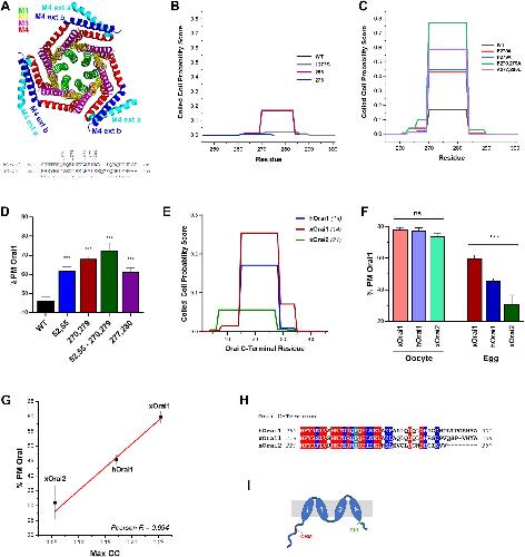 Figure 4. C-terminal CC structure regulates Orai1 internalization. (A) Orai1 crystal structure in the closed conformation (4HKR) with the 4 transmembrane helices in the hexameric Orai1 channel color coded as indicated. The M4 helical extensions that form the CC from adjacent subunits are shown in dark and light blue. CC sequence alignment between human and Drosophila Orai1 is also shown. (B, C) CC predictions using the COILS algorithm with a window of 14 residues41. (D) Percent PM Orai1 for the different mutants as indicated (Meanâ±âSEM, nâ=â13â26 eggs from 4 donor females). *** (pâ<â0.001), one way ANOVA. (E) CC predictions for the different Orai isoforms using the COILS algorithm. In this case the window that gave the highest CC probability is shown and is indicated in italics in parentheses. Human Orai1 (hOrai1, Q96D31), Xenopus Orai1 (xOrai1, Q5EAU0), and Xenopus Orai2 (xOrai2, Q6NZI6). (F) Percent Orai at the PM in both oocytes and eggs for the different clones as in panel (E). Meanâ±âSEM, nâ=â9â27 eggs from 3 donor females. *** (pâ<â0.001), ns (not significant), one way ANOVA. (G) Plot of percent Orai at the PM as a function of maximal CC probability for the three Orai isoforms. (H) Sequence alignment of the C-termini of hOrai1, xOrai1 and xOrai2. (I) Cartoon topology of Orai1 showing the CBM domain in the N-terminal cytosolic region and cytoplasmic internalization handle domain (CIH) in the Orai C-terminus. |