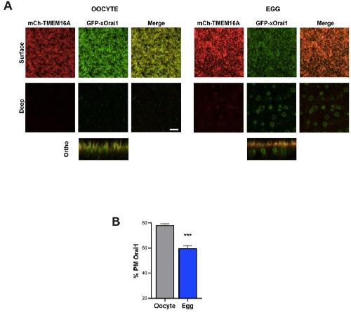 A. Example confocal images at the plasma membrane plane (Surface) or in a cytosolic plane (Deep) and orthogonal sections from Xenopus oocytes and mature eggs expressing TMEM16A- mCherry with GFP-tagged Xenopus Orai1 (xOrai1). Oocytes were imaged through the PM generating a z-stack of images. Ortho shows an orthogonal cross section across the entire z-stack to show the distribution of TMEM and Orai1. Scale is 5 μm. B. Quantification of the percent xOrai1 at the PM in both oocytes and eggs. Mean + SEM, n = 16-27 eggs from 3 different donor females. *** (p<0.001), unpaired t test. |