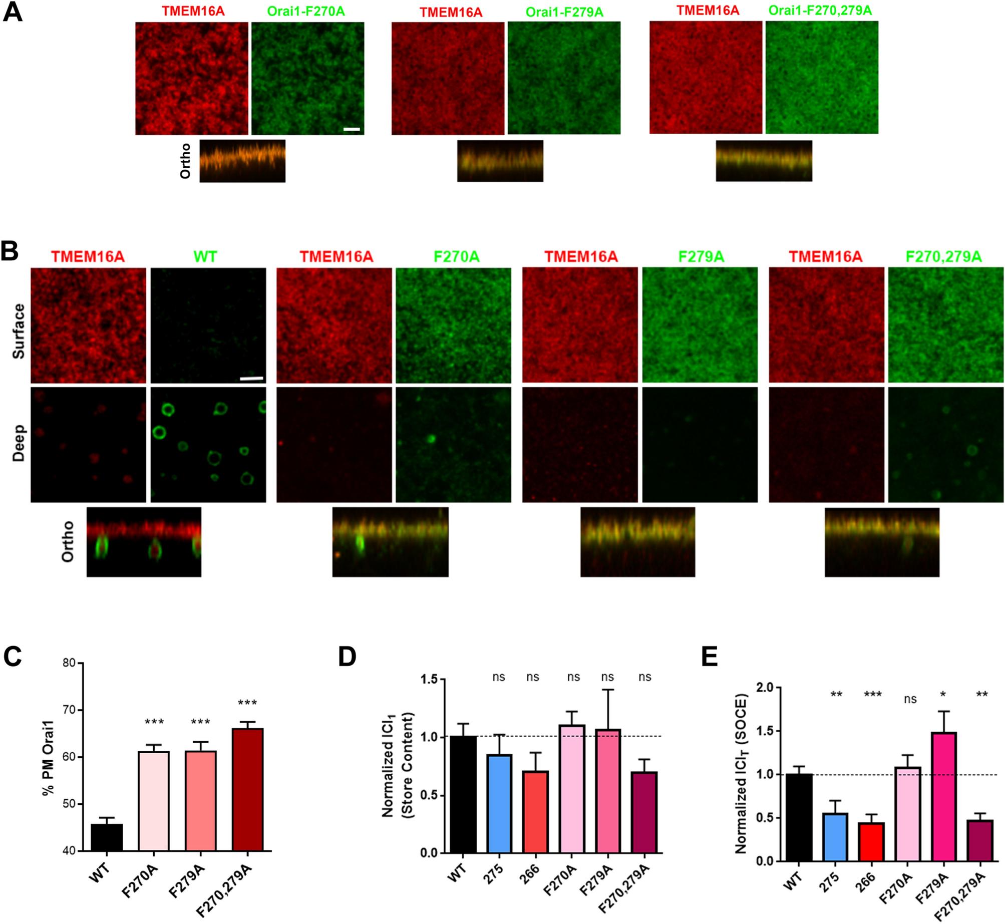 Figure 2. Internalization and functionality of the FXXΦ mutants. (A, B) Confocal images from oocytes (A) and eggs (B) expressing TMEM16A with GFP-Orai1 WT, F270A, F279A, or F270,279A mutants under similar conditions as in Fig. 1C and 1D. Scale bar is 3 µm. (C) Percent Orai1 at the PM (Meanâ±âSEM, nâ=â12â42 eggs from 9 donor females). (C, D) Normalized Cl1 (ICl1) (C) and ClT (IClT) (D) currents from oocytes expressing STIM1 with the different Orai1 mutants as indicated (Meanâ±âSEM, nâ=â5â25 oocytes from 5 donor females). *(pâ<â0.05), **(pâ<â0.01), *** (pâ<â0.001), ns (not significant), one-way ANOVA. |