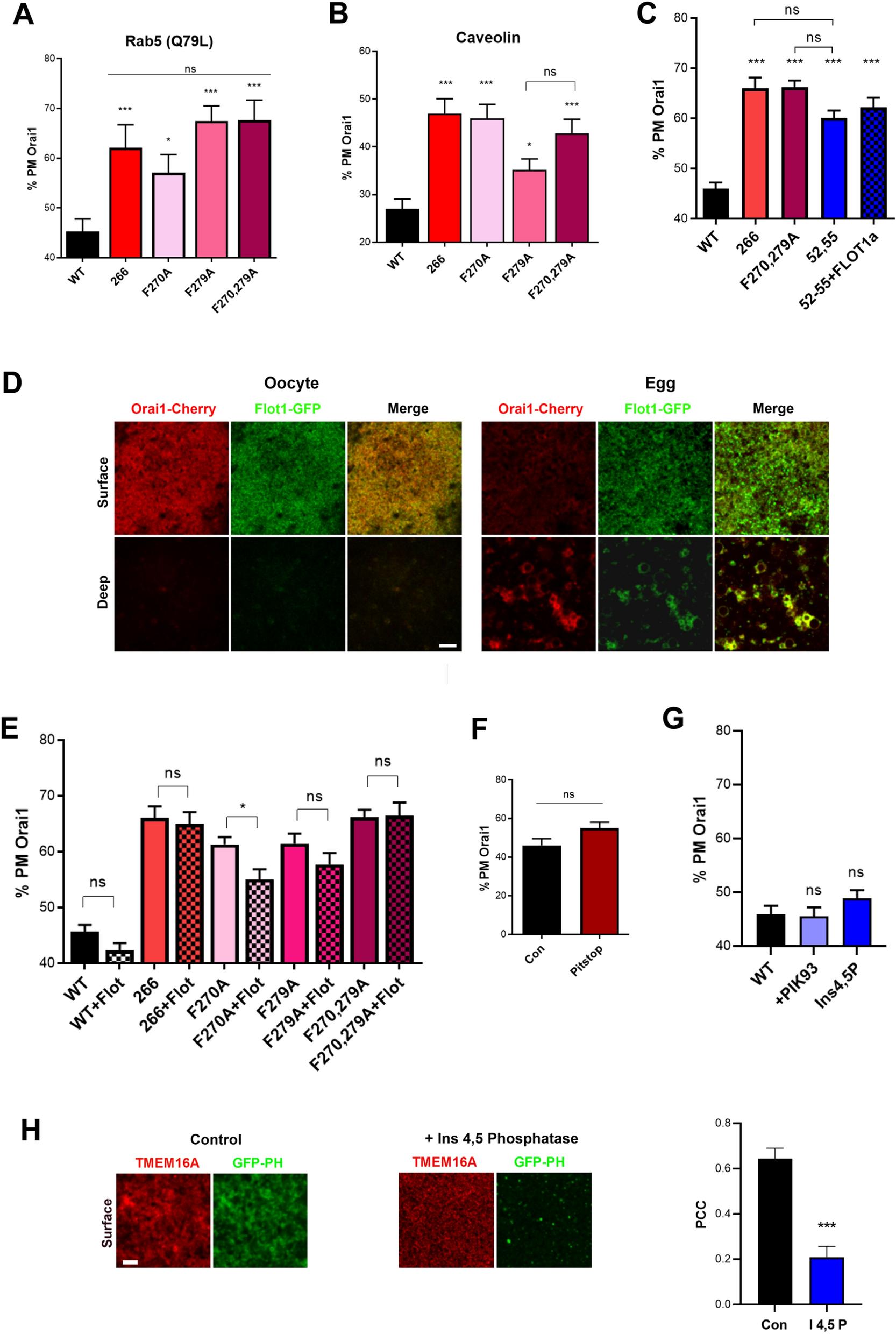 Figure 3. Role of flotillin, PIP2 and clathrin in Orai1 internalization. (A, B) Quantification of the percent Orai1 at the PM in eggs expressing the different mutants as indicated with either a constitutively active Rab5 mutant (Q79L) (A) or caveolin (B) (Meanâ±âSEM, for (A) nâ=â10â26 eggs, for (B) nâ=â7â23 eggs). *(pâ<â0.05), *** (pâ<â0.001), ns (not significant) , one-way ANOVA. (C) Percent Orai1 at the PM for the different conditions as indicated (Meanâ±âSEM, nâ=â12â19 eggs from 4 donor females. *** (pâ<â0.001), ns (not significant), one-way ANOVA. (D) Confocal images from oocytes and eggs expressing mCherry-Orai1 and flotillin1-GFP (Flot1-GFP). Scale bar is 3 µm. (E) Percent Orai1 at the PM for the different conditions as indicated (Meanâ±âSEM, nâ=â11â57 eggs from 5 donor females). * (pâ<â0.05), ns (not significant), one-way ANOVA. (F) Percent PM Orai1 in eggs pretreated with either vehicle (DMSO) or Pitstop 2 (10â5 M) 2 h after progesterone addition to block clathrin-dependent endocytosis (Meanâ±âSEM, nâ=â10â13 eggs from 3 donor females), ns (not significant), unpaired t test. (G) Percent PM Orai1 in eggs treated with PIK93 (0.5 µM) or expressing Ins4,5P (Meanâ±âSEM, nâ=â15â28 eggs from 3 donor females). ns (not significant), one-way ANOVA. (H) Confocal images from eggs co-expressing GFP-PH and TMEM16A-mCherry (Control) or co-injected with Ins4,5P RNA (+âIns 4,5 Phosphate). Scale bar is 3 µm. The right panel shows the Pearson Correlation Coefficient for TMEM16A and GFP-PH at the PM plane (Meanâ±âSEM, nâ=â7 eggs). *** (pâ<â0.001), unpaired t test. |