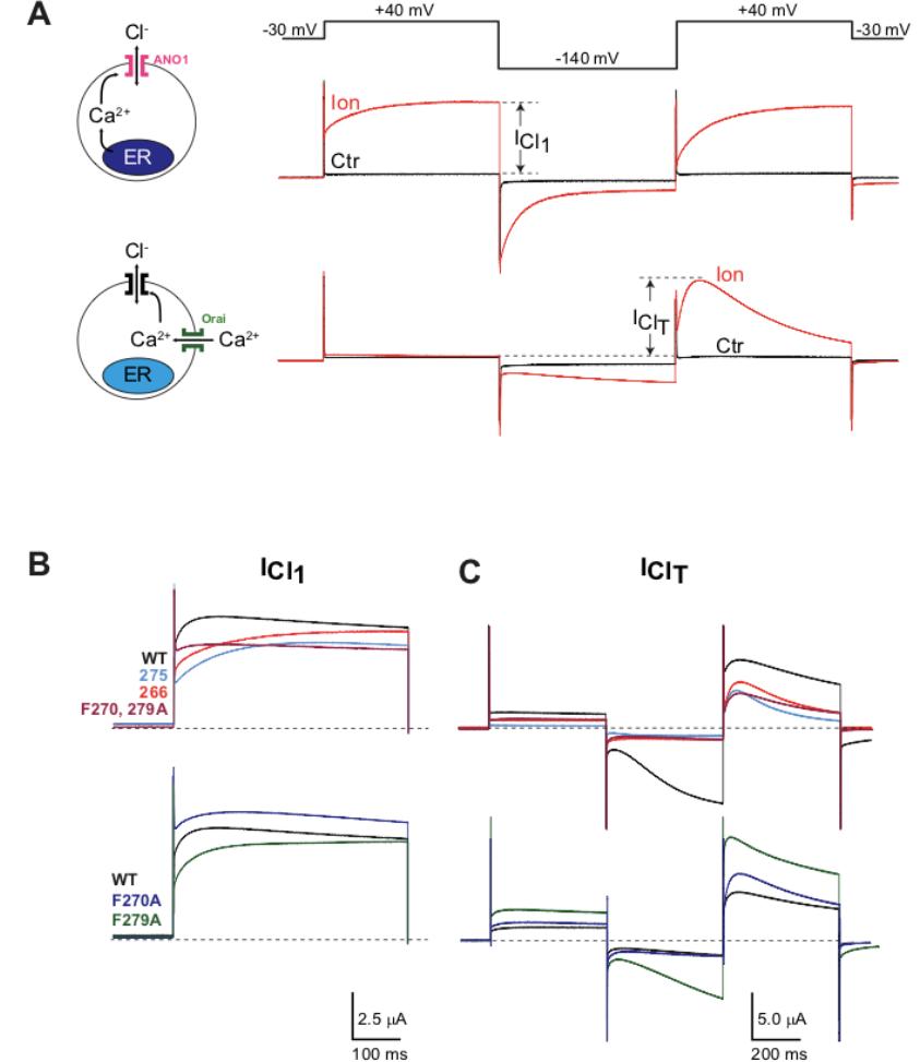A. Cartoon of Ca2+ release and Ca2+ influx activation of CaCC and example traces of activation of ICl1 in response to Ca2+ release from store (top traces) as well as IClT in response for Ca2+ influx through SOCE following store depletion. Ionomycin (Ion) was used to deplete stores in this case. The voltage protocol used is shown above the traces and was designed to depolarize the cell membrane using the +40 mV pulse to minimize the driving force for Ca2+ influx, with the -140 mV pulse designed to induce Ca2+ influx following store depletion to measure SOCE. SOCE was measured using the transient Cl current during the second +40 mV pulse (IClT) that responds to Ca2+ influx during the -140 mV pulse 1. B-C. Example traces from the different mutants during the Ca2+ release phase (ICl1) from the first +40 mV pulse (B) and SOCE phase (IClT) from the second +40 mV pulse (C).