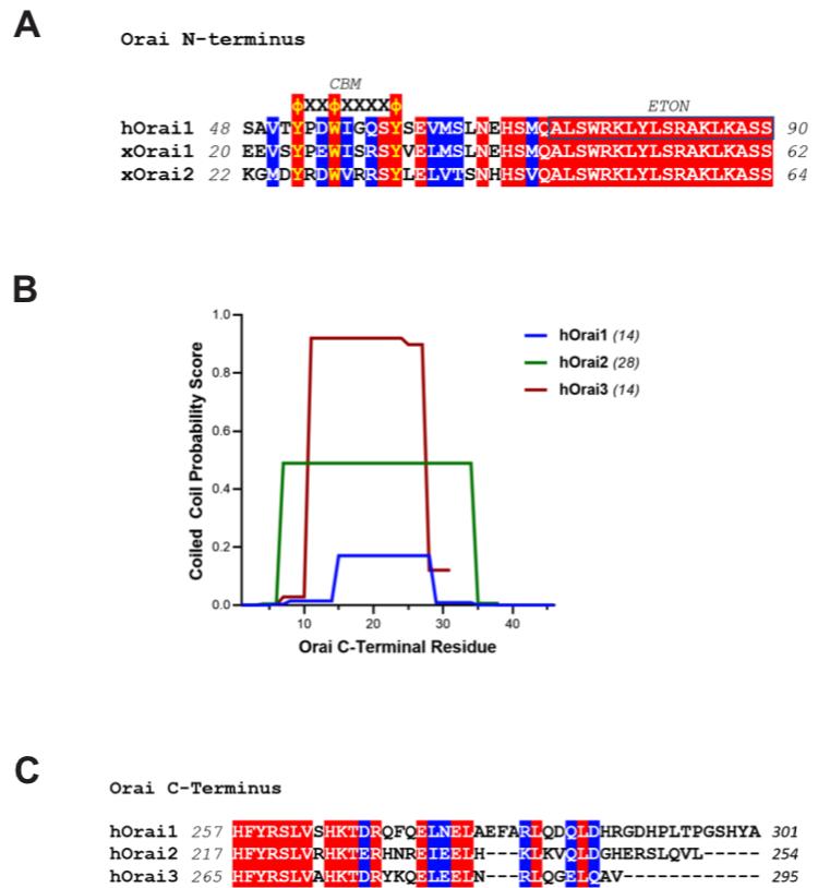 A. Sequence alignment of the N-termini of Human Orai1 (hOrai1, Q96D31), Xenopus Orai1 (xOrai1, Q5EAU0), and Xenopus Orai2 (xOrai2, Q6NZI6). The caveolin binding motif with its consensus is indicated as well as the extended transmembrane Orai N-terminal (ETON) of Orai1. B. CC predictions for the different human Orai isoforms using the COILS algorithm. The window with the highest CC probability is shown and is indicated in italics in parentheses. hOrai1 (Q96D31), hOrai2 (Q96SN7), hOrai3 (Q9BRQ5). C. Sequence alignment of the N- termini of Human Orai isoforms.