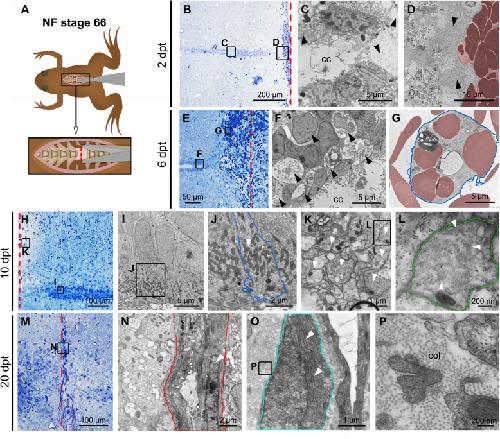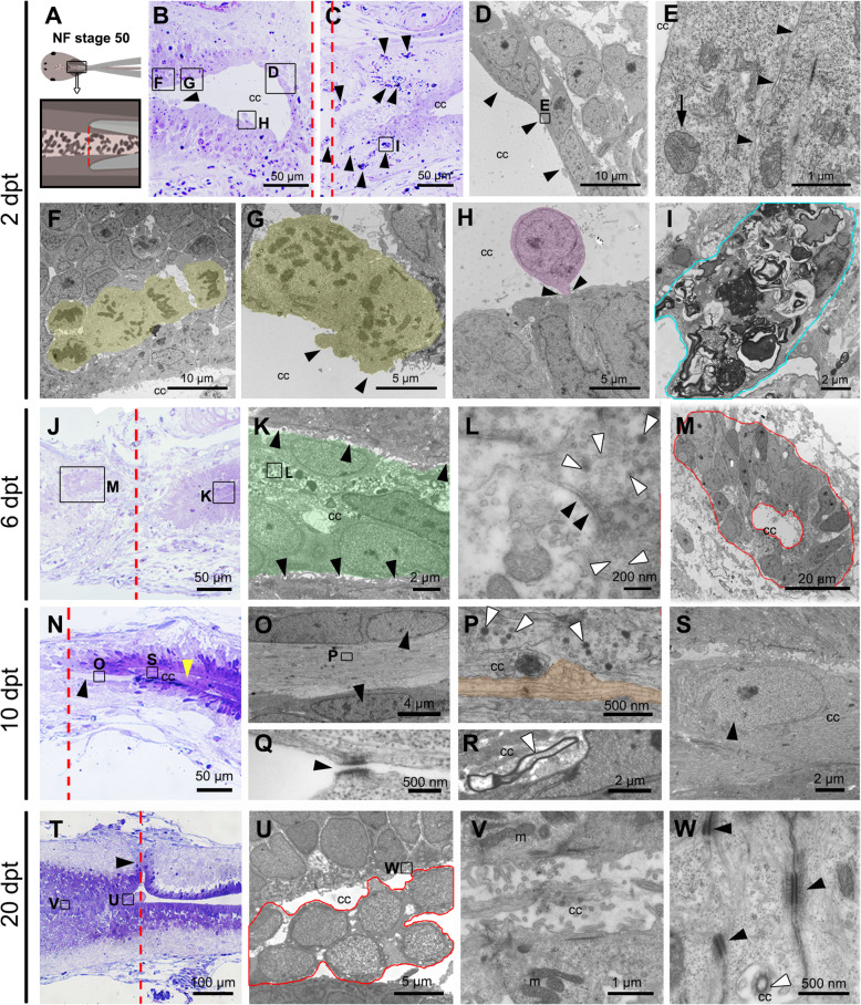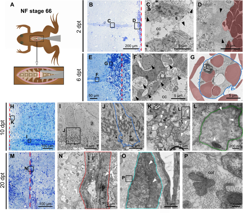 Fig. 2. Cellular response to injury in Non-Regenerative Stage. a Cartoon depicting the process of spinal cord injury in NF stage 66. b Semithin section at 2 dpt. c, d; f-g; i-l; n-p Correspond to ultrathin sections observed by transmission electron microscopy. c, d Different regions of the spinal cord at 2 dpt; c central canal (cc) next to the injured site (black arrowheads); d extracellular matrix and red blood cells (red shadow) in the injury site. e Semithin section at 6 dpt. f, g Different regions of the spinal cord at 6 dpt; f ependymal cells in the rostral stump (black arrowheads); g macrophage (blue line) engulfing red blood cells (red shadow) in the cc. h Semithin section of the caudal stump at 10 dpt. i-l Different regions of the spinal cord at 10 dpt; i ependymal cells near to the injured site; j mitochondria (white arrowhead) in the apical surface of ependymal cell (blue line) in contact with the cc; k glial cell processes next to the injured site (white arrowheads); l intermediate filaments (white arrowheads) in the glial process (green line). m Semithin section at 20 dpt. n-p Different regions of the spinal cord at 20 dpt; n ablation gap (red lines) filled with fibroblast-like cell (white arrowhead), and surrounded by extracellular matrix; o microglial-like cell (cyan line) with abundant rough endoplasmic reticulum (white arrowheads); p abundant Collagen (col) fibers (dots) in the injured site. The red dotted lines indicate the injured site (a, b, e, h, m) |