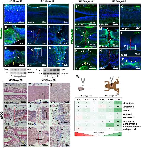 Fig. 3. Glial cell and extracellular matrix response to spinal cord injury in R-Stage and NR-Stage. a-c Immunostaining against vimentin in a uninjured, and at b 2 and c 6 dpt from animals at NF stage 50. d Western blot against Vimentin (Vim) and GAPDH of spinal cords samples obtained from uninjured (ui), and at 2, 6, 10 and 20 dpt in animals at NF stage 50. e-g Immunostaining against Vimentin in uninjured (e-eâ), and at (f, fâ) 10 and (g-gâ) 20 dpt from animals at NF stage 66. h Western blot against Vim and GAPDH of spinal cords samples obtained from uninjured (ui), and at 2, 6, 10 and 20 dpt in animals at NF stage 66. i-o Immunofluorescence against fibronectin in i uninjured, j 6 dpt, and k 10 dpt in NF stage 50; and l uninjured, m 10 dpt, and n 30 dpt in animals at NF stage 66. o-p Immunofluorescence against CSPG in o uninjured, and p-pâ at 40 dpt in NF stage 66. q-v AFOG staining shown Collagen (blue), cells (orange) and Fibrin (red) in q uninjured, and at r 6 and s 10 dpt in animals at NF stage 50, and in t-tâ uninjured, and at u-uâ 10 and v-vâ 20 dpt from animals at NF stage 66. w Analysis of gene expression change upon spinal cord injury comparing injured animals (Ts) with control sham (sham) surgery at 1, 2 and 6âdays after injury in NF stage 50 (1R, 2R and 6R), and NF stage 66 (1NR, 2 NR and 6 NR). Colored and crosses scale indicates the level of increase upon injury in green (+, ++, +++) and decrease in red (â, ââ, âââ), data obtained from a previous RNAseq analysis [49]. The red dotted lines (b, f, g, j, m, n, p, r, u, v) and yellow arrows (c, k, s) indicate the injured site. Nuclei stained with Hoechst in blue (a-c; e-g; i-p) |