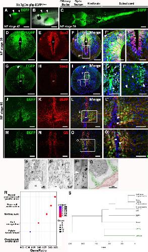 Fig. 4. Zebrafish regulatory regions of GFAP drive expression of EGFP in neural stem and progenitor cells, and astrocytes in Xenopus laevis spinal cord. A-C Lateral view of EGFP expression in the central nervous system at A, B NF-Stage 43, and C NF-Stage 50. A EGFP expression in the eye, brain and spinal cord (arrowheads). B EGFP/brightfield merge. C Dorsal view of EGFP expression in the optic tectum, hindbrain and spinal cord at NF stage 50. D-F Double staining against D EGFP and E Sox2. Panels F showed merge image, and Fâ, Fâ magnifications of the dorsal and ventral cells surrounding the central canal. G-Oâ Characterization of EGFP cells by double staining at NF stage 66. G-Iâ EGFP and Sox2; J-Lâ EGFP and Brain lipid-binding protein (BLBP); and M-Oâ EGFP and Glutamine synthase (GS). Nuclei are label in blue with Hoechst. P-Q Immunogold staining against EGFP at NF stage 50. P EGFP+ cell in contact with the central canal. Pâ Magnification of square in P. Expression of EGFP is visualized by the black dots of the gold staining. Pâ Magnification of square in Pâ. Gold staining (black arrowhead) in close apposition with filaments (white arrowhead). Q Endfeet from an EGFP+ cell (colored green) in close contact with blood vessel (colored red). R Gene ontology analysis of the RNAseq from EGFP+ cells revealed the stem cell/neural precursor cell identity of these cells. S Dendrogram of EGFP+ cells and EGFPâ cells showing the hierarchical clustering of EGFP+ cells with astrocytes and EGFPâ cells with neurons and oligodendrocytes. Scale bar: C, Fâ-Fâ³: 20âμm; A-B, D-F, Iâ-Iâ³, Lâ, Oâ: 50âμm; G-I, J-L, M-O: 200âμm |