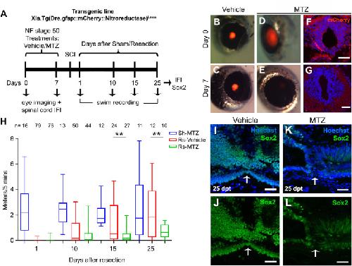 Fig. 7. Ablation of NSPCs blocks spinal cord regeneration. a Diagram of the treatment of zGFAP::mCherry-NTR transgenic animals with metronidazol (MTZ) or vehicle, followed by spinal cord resection, swimming recording, and histological analysis. b-e Eye imaging (b, d) before treatment, and 7âdays after incubation with c vehicle or e MTZ. f, g Spinal cord sections showing mCherry expression f before, and g 7âdays after MTZ treatment. h Graph of swimming at 1, 10, 15, 25 dpr in sham (Sh) operated animals treated with MTZ (Sh-MTZ, blue boxes), and resected (Rs) animals incubated with vehicle (Rs-Vehicle, red boxes) or MTZ (Rs-MTZ, green boxes). i-l Immunofluorescence against Sox2 (green) and nuclei stained with Hoechst of spinal cord sections obtained from animals at 30 dpr from the i, j Rs-vehicle, and k, l Rs-MTZ treated groups. Statistics in graph H: ANOVA-one way with Bonferroni post-test, ** pâ<â0.01, nâ=â4 independent biological replicates |