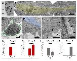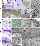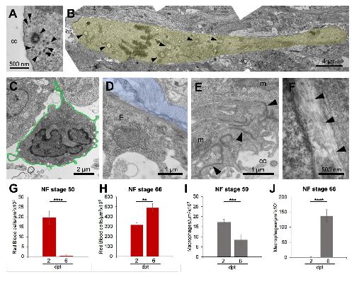 Figure S1. Cellular response to spinal cord injury in R- and NR-stages. (A) Centriolar satellite ultrastructure (arrowheads) in cells surrounding the rostral stump. (B) Radial projection of cells lining the central canal (yellow shadow). (C) Neutrophil in the injury site at 2 dpt in animals at NF stage 50. (C-E) Cells lining a rosette structure at 6 dpt are characterized by a (D) basal collagen lamina (blue shadow), (E) interdigitations and adherent junctions (arrowheads), and (F) intermediate filaments (arrowheads). Graphs of the number of red blood cells/μm2 Ãâ105 at (G) 2 and 6 dpt in NF stage 50, and (H) at 2 and 6 dpt in NF stage 66. Graphs of the number of macrophages/μm2 Ãâ105 at (I) 2 and 6 dpt in NF stage 50, and (J) at 2 and 6 dpt in NF stage 66. t-Test: ** pâ<â0,01; *** pâ<â0,001; **** pâ<â0,0001. |