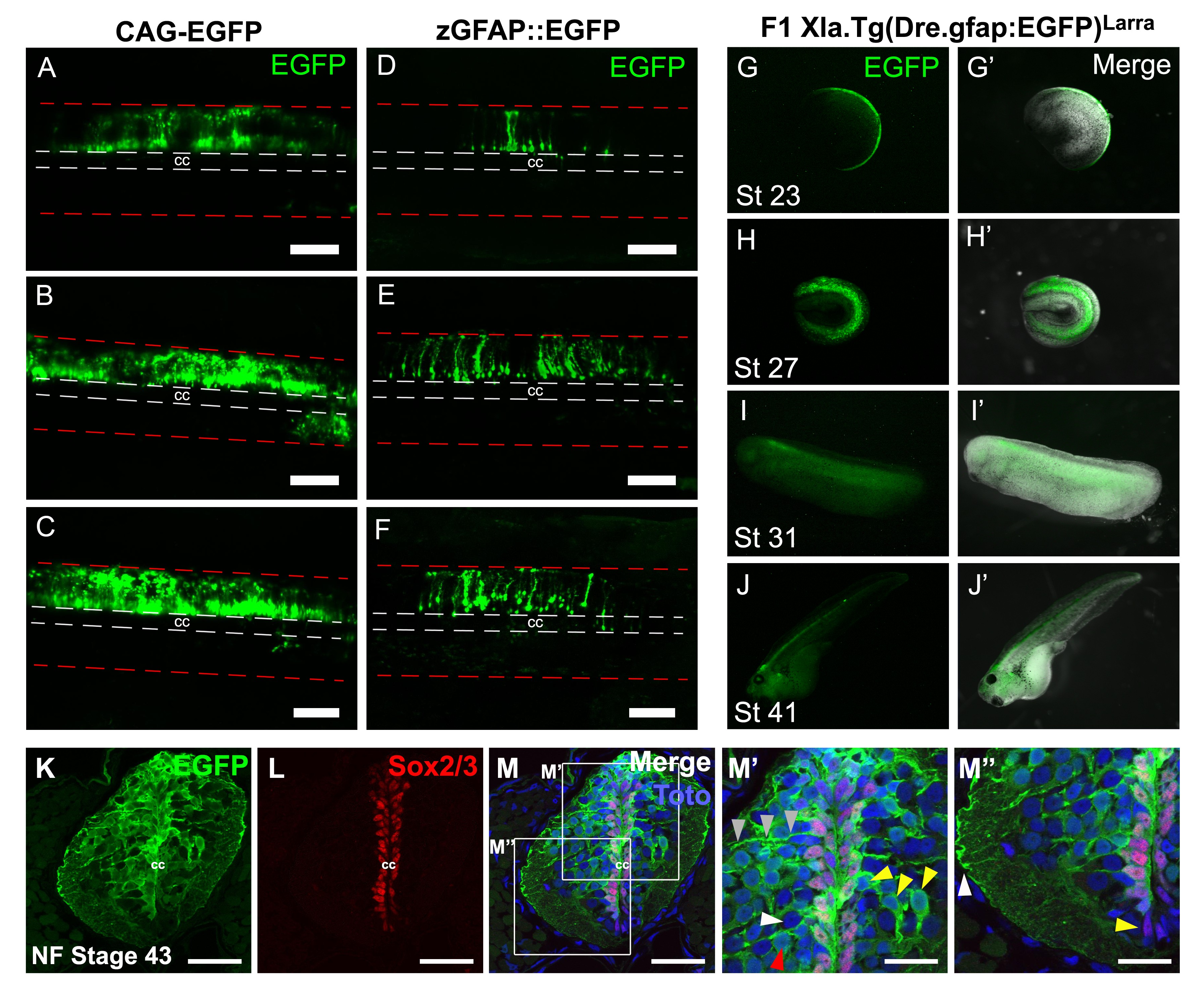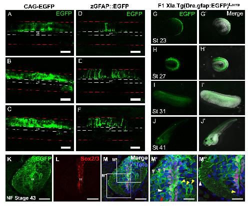 Figure S4. Transgenic line Xla.Tg(Dre.gfap:EGFP)Larra. (A-C) Three different animalsâ electroporated in the spinal cord with the CAG promoter driving the expression of EGFP in central canal cells. (D-F) Three different animals electroporated in the spinal cord with the zGFAP::EGFP construct driving specific expression in radial glial like cells in contact with the central canal. (G-J) Animals at different developmental stages of the transgenic line Xla.Tg(Dre.gfap:EGFP)Larra show in expression of EGFP in the neural tubeg at (G-Gâ) NF stage 23; (H-Hâ²) NF stage 27; (I-Iâ²) NF stage 31 and in the CNS at (J-Jâ) NF stage 41. (K-M) Double staining against (K) EGFP and (L) Sox2 in coronal section of the spinal cord at NF stage 43. Panels (M) showed merge image, and panels (Mâ, Mâ) are magnifications of the dorsal and ventral cells surrounding the central canal. |