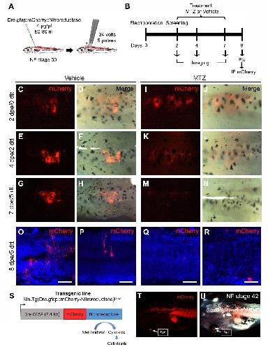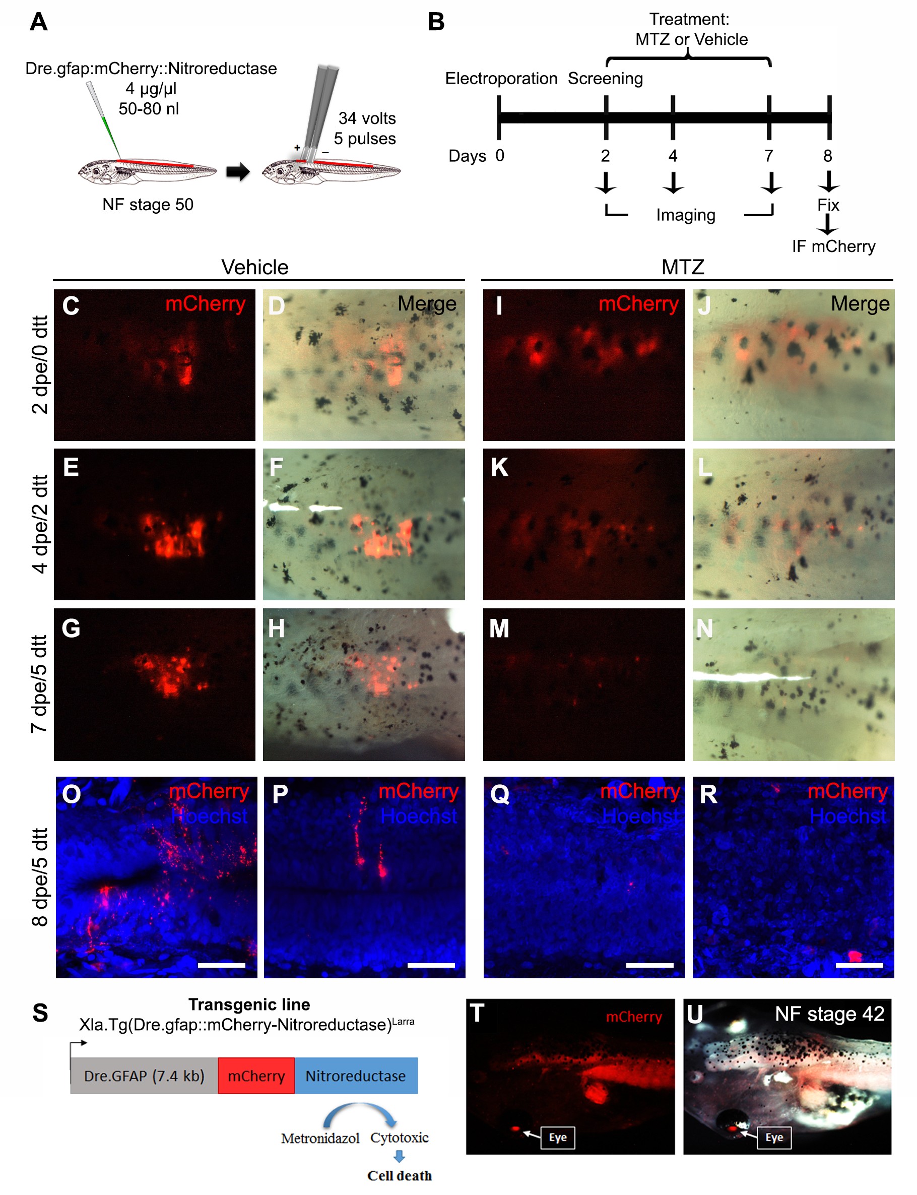 Figure S7. Transgenic line Xla.Tg(Dre.gfap:mCherry-Nitroreductase) allows selective cell ablation. (A) Diagram of injection and electroporation of the spinal cord at NF stage 50, indicating volume, concentration and parameters of electroporation. (B) Scheme of electroporation of the Dre.gfap:mCherry-Nitroreductase construct and treatment with vehicle or metronidazol (MTZ) at NF stage 50. (C-R) mCherry (red) expression in the spinal cord of animal electroporated at (C-D; I-J) 2âdays post electroporation (dpe), before treatment; (E-F; K-L) 4 dpe and 2âdays post treatment (dtt); (G-H; M-N) 7 dpe and 5 dtt, and (O- R) at 8 dpe and 6 dtt co-stained with Hoechst (blue). (S) The construct used to generate the transgenic line Xla.Tg(Dre.gfap:mCherry-Nitroreductase). (T, U) mCherry expression in the eye (arrow) and the brain of the transgenic animal at NF stage 42. |