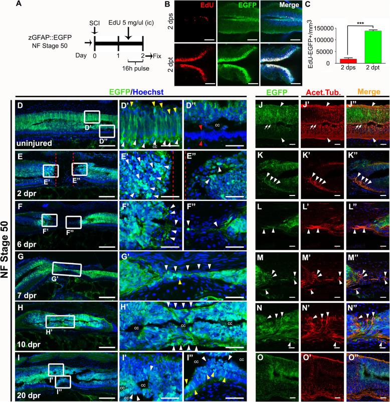 Fig. 5. Response to injury of Neural Stem and Progenitor Cells. a Scheme of EdU treatment. b Click-iT staining for EdU (red), and immunofluorescence against EGFP (green), merge with nuclei (blue) in sham control animals at 2âdays post sham operation (dps), and 2 dpt. c Graph of EdU-EGFP positive cells per mm3 at 2 dps (red bar) and 2 dpt (green bar). t-Test, ***: pâ<â0.001. d, e, f, g, h, i Immunofluorescence against EGFP (green) at NF stage 50 in d uninjured, e 2âdays post resection (dpr), f 6 dpr, g 7 dpr, h 10 dpr, and i 20 dpr. Magnifications are shown in panels dâ-dâ, eâ-eâ, fâ-fâ, gâ, hâ and iâ-iâ. j, k, l, m, n, o. Serial sections from the same preparation shown in panels d, e, f, g, h, i double stained for EGFP (green) with the neuronal marker Acetylated tubulin (red), and merge (orange). Nuclei are label in blue with Hoechst. White arrowhead highlights colocalization. Scale bar: d, e, f, g, h, i: 200âμm; dâ-dâ, eâ-eâ, fâ-fâ, gâ, hâ, iâ-iâ, j-jâ, k-kâ, l-lâ, m-mâ, n-nâ, o-oâ: 50âμm |