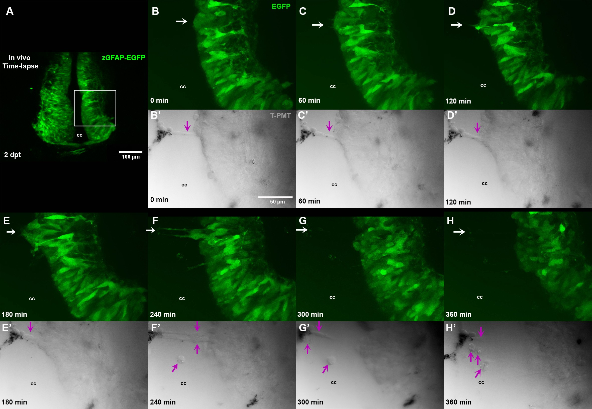 Figure S2. In vivo time-lapse imaging of cells being extruded into the central canal. (A) Rostral stump of the transected spinal cord from a zGFAP::EGFP transgenic animal at R-stage 2 dpt. A time-lapses during 7âh for EGFP and transmitted light (T-PMT) z-stack were capture at the following time points: (B-Bâ²) 0âmin; 60âmin (C-Câ²); 120âmin (D-Dâ²); 180âmin (E-Eâ); 240âmin (F-Fâ²); 300âmin (G-Gâ); 360âmin (H-Hâ²). White and purple arrows point to extrusion events from the cells lining the central canal. |