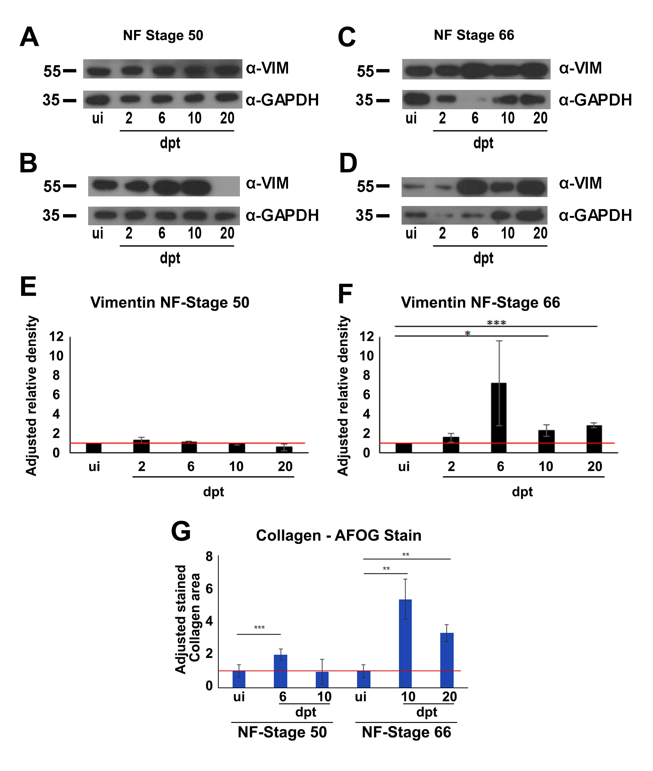 Figure S3. Quantification of Vimentin Western Blot and Collagen AFOG staining. Western blot replicates for Vimentin and GAPDH in uninjured animals (ui), and after 2, 6, 10, 20 dpt in (A, B) R-Stage and (C, D) NR-Stage. Graphs of the adjusted relative density bands of Vimentin to the GAPDH control and normalized to the uninjured sample (ui) in (E) R-stage and (F) NR-stage at 2, 6, 10 and 20âdays post transection (dpt) spinal cord samples. (G) Graph of the adjusted collagen staining area relative to the uninjured (ui) animals at 6, 10 dpt of R-stage and 10, 20 dpt of NR-stage. Red line defined no changes of Vimentin levels or Collagen staining. t-Test: * pâ<â0,05; ** pâ<â0,01; *** pâ<â0,001. |