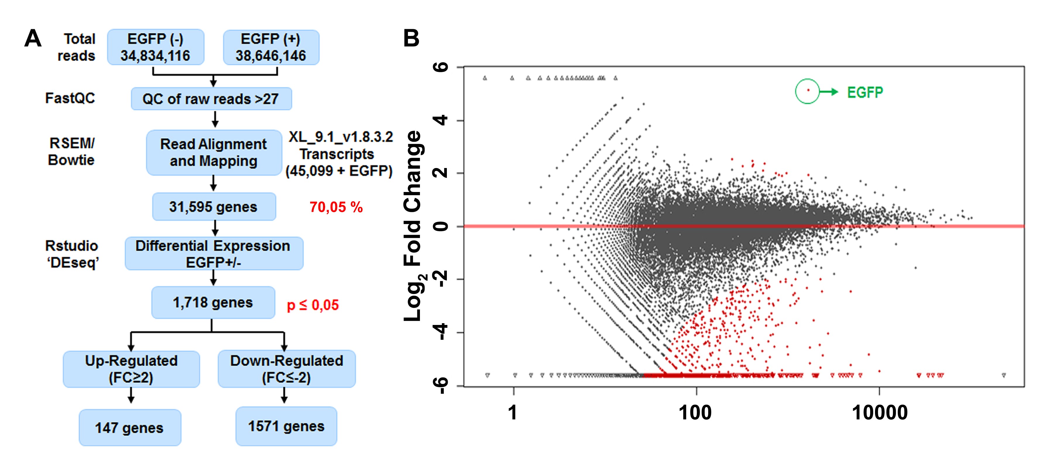 Figure S5. RNAseq of EGFP+ and EGFP− cells isolated from the transgenic line Xla.Tg(Dre.gfap:EGFP)Larra. (A) Flow chart of RNAseq bioinformatics analysis from EGFP+ and EGFP− cells. (B) Graph of the Log2 fold change of the differential gene expression between EGFP+ cells versus EGFP− cells after FACS and RNAseq. EGFP expression in EGFP+ cells (green) is highlighted. |