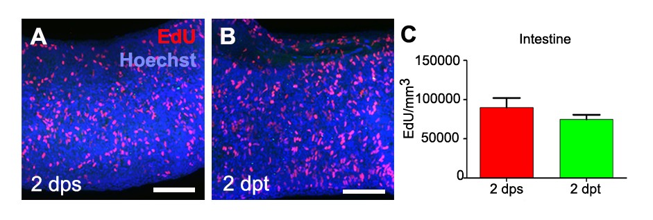 Figure S6. Analysis of EdU+ cells in the intestine. (A-B) Click-iT staining of EdU+ (red) of the intestine in (A) sham control animals (2 dps), and at (B) 2 dpt. Nuclei were stained with Hoechst (blue). (C) Graph of EdU+ cells per mm3 in the intestine. nâ=â3. |