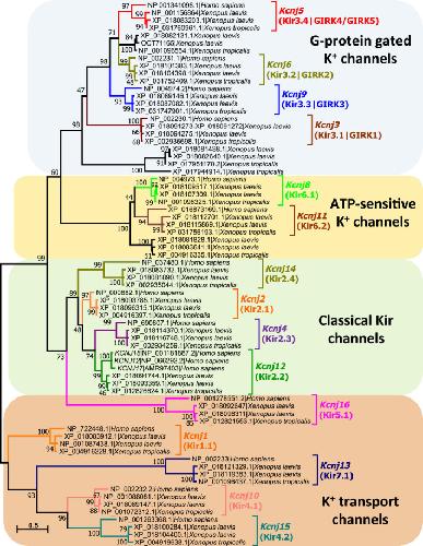 Fig. 2. Phylogenetic analysis of inwardly rectifying potassium (Kir) channels present in human, X. laevis and X. tropicalis. The phylogenetic tree was constructed with 72 Kir protein sequences (17 from human, 19 from X. tropicalis, and 36 from X. laevis (a tetraploid frog) that can be classified into four functional groups. Accession numbers of each protein sequence as well as Kir channel subfamilies previously described in humans are indicated. The evolutionary history was inferred from 500 replicates, using the Maximum Likelihood method based on the Jones–Taylor–Thornton matrix‐based model w/freq. The tree with the highest log likelihood (−21 352.85) is shown. Evolutionary analyses were conducted in MEGA7 [40], considering a total of 581 positions in the final dataset. Tree branches are drawn to scale, with the bar length indicating the number of substitutions per site. The percentage of trees in which the associated taxa clustered together in the bootstrap test (500 replicates) is shown next to the branches. Branch lengths represent the number of substitutions per site as indicated by the bar. |