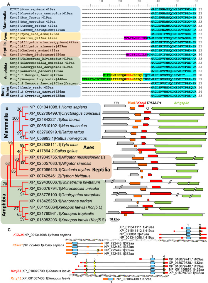 Fig. 3. Sequence analysis of some selected GIRK4/GIRK5 channels that belong to fishes, amphibians, reptiles, avian, and mammals. (A) Multiple amino acid sequence alignment of 22 GIRK4/GIRK5 channels showing the N termini of the proteins: residues from homologous exons are lighted with the same color (green, yellow, pink, or light blue). The noncanonical KRLY retention signal of GIRK5 from X. laevis and X. tropicalis is indicated in red letters into their second exon (yellow lighted). Sequence names indicate coding gene | species name | protein sequence length. (B) Phylogenetic analysis and gene context (synteny) of selected GIRK4/GIRK5 channels. The phylogenetic tree was constructed with 22 GIRK4/GIRK5 protein sequences coded by Kcnj5 genes. Sequence names indicate accession number for each GIRK4/GIRK5 protein channel followed by the species name. The evolutionary history was inferred from 500 replicates, using the Maximum Likelihood method based on the JonesâTaylorâThornton matrixâbased model w/freq. Percent bootstrap values are shown next to the branches. Evolutionary analyses were conducted in MEGA7 [40]. The gene context (synteny) of each Kcnj5 gene is indicated to the right of each sequence included in the tree (arrows represent genes and direction of transcription). Flanking Kcnj1âKcnj5 gene pair (coding for Kir1.1 and GIRK4/GIRK5 channels, respectively), Arhgap32 gene (encoding a Rho GTPase activating protein 32), and Fli1 (encoding Friend leukemia integration 1 (Fliâ1) protoâoncogene) can be found; in humans, TP53AIP1 gene, coding for tumor protein p53 regulated apoptosis inducing protein 1 is located between KCNJ5 and ARHGAP32 genes. GIRK4/GIRK5 sequences from fishes are not shown because their synteny is not conserved; and synteny of X. laevis Kcnj5.S is not shown because the available sequence is just a fragment. Genes are drawn on the same scale. (C) intronâexon structure comparison between Kcnj1 and Kcnj5 gene pair from human and X. laevis. Coding exons are indicated by arrows (colored according to the colors used in panel A), untranslated region by short boxes (colored red for Kcnj5, and orange for Kcnj1), and introns by black lines. |