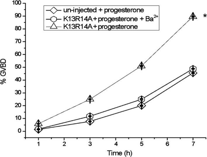 Fig. 5. Effect of external barium block on GIRK5âprogesteroneâinduced oocyte maturation. %GVBD was determined after 7 h of incubation in the ND96 solution, barium (111 μm) and progesterone (10 μm). (*) indicates a significant difference with respect to the other treatments (oneâway ANOVA, P < 0.01). Error bars correspond to mean ± SE, n = 15. |