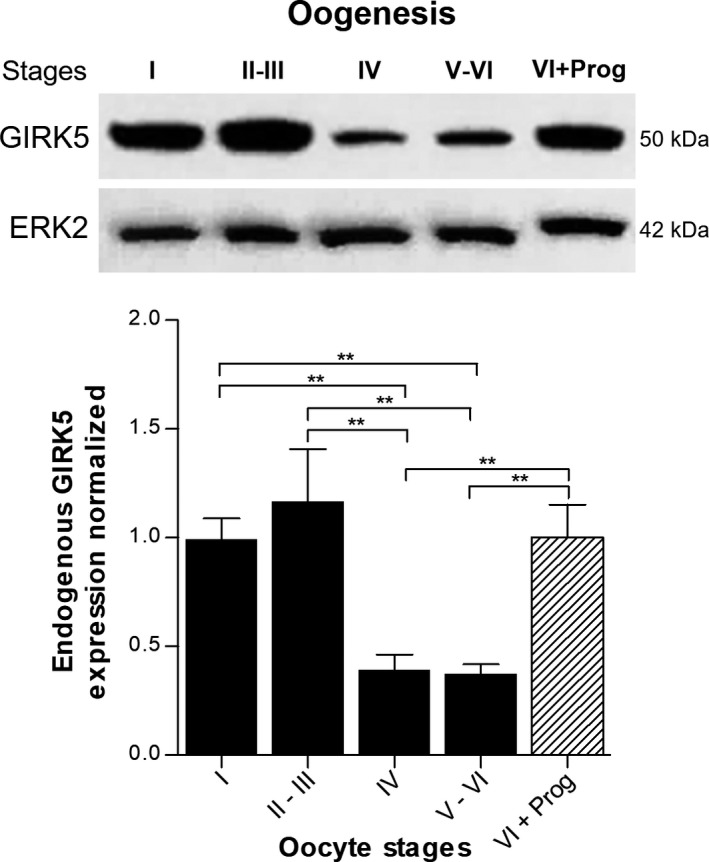 Fig. 6. Relative abundance of GIRK5 channel in different stages of X. laevis oocytes. GIRK5 expression was evaluated by immunoblotting with a specific antibody (see Materials and methods). (**) Significant difference between the oocytes stages (one‐way ANOVA P < 0.05). Error bars correspond to mean ± SE (n = 3). VI + Prog, stage VI oocytes incubated with 10 μm progesterone (7 h). |