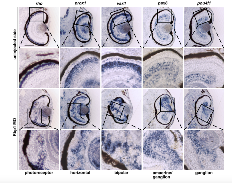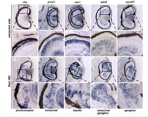 Figure 3. Loss of retinol binding protein 1 leads to disordered retinal layers. Transversal sections of retinol binding protein 1 (Rbp1)- or control morpholino oligonucleotide (MO)-injected embryos at stage 42. Rbp1 knockdown led to deformed and disorganized retinal layers, including rosette-like structures (close-up views) and altered retinal pigmented epithelium (RPE; red arrowheads), as shown by marker gene expression. Four of the 9 embryos showing rho expression (photoreceptor cells), 4 of the 7 embryos showing prox1 expression (horizontal cells), 5 of the 7 embryos showing vsx1 expression (bipolar cells), 6 of the 10 embryos showing pax6 expression (amacrine and ganglion cells) and 2 of the 4 embryos showing pou4f1 expression (ganglion cells) had an altered phenotype, as depicted. In contrast, the uninjected side of the embryos showed no changes of retinal lamination. Scale bar: 100 μm. Abbreviation: MO, morpholino oligonucleotide |