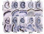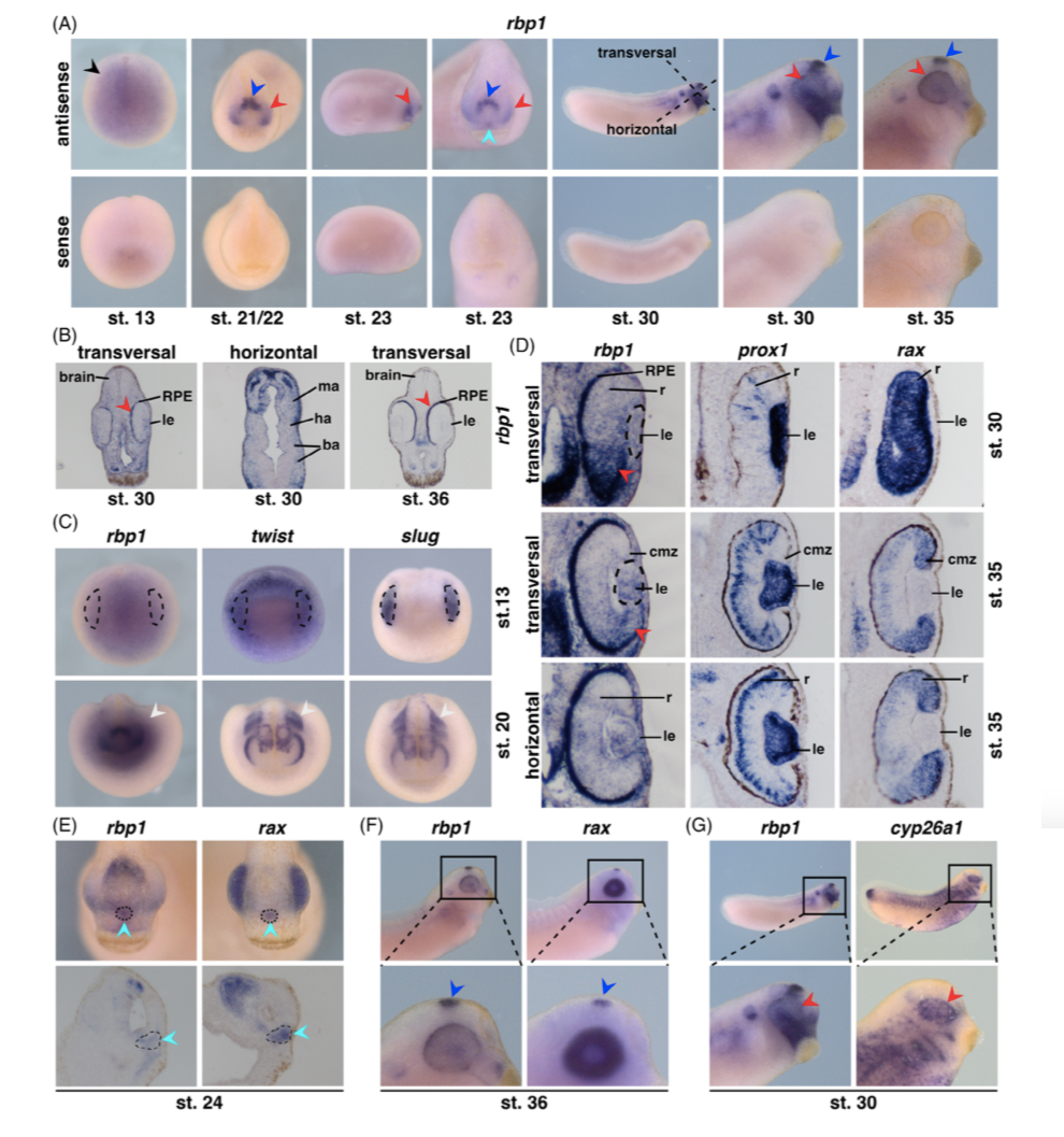 Figure 1. Retinol binding protein 1 expression in early embryonic development of the Xenopus. A, Anterior (St. 13, 21/22, 23) and lateral (St. 23, 30, 35) views of embryos at the indicated stages. The upper row shows embryos treated with an rbp1 antisense probe and the lower row, embryos treated with an rbp1 sense probe. Whole mount in situ hybridization experiments revealed rbp1 expression in the anterior neural tissue at stage 13 of Xenopus embryos (black arrowheads). At stages 21 to 35, rbp1 transcripts were determined in the developing eye (red arrowheads), the ventral part of the forebrain (turquois arrowhead) and the pineal gland (blue arrowhead). The dotted lines at stage 30 in A represent the levels of the sections shown in B. B, Rbp1 expression was detected in the RPE of the eye at stages 30 (left panel, transversal section, red arrowhead) and 36 (right panel, transversal section, red arrowhead) and in the anterior neural crest cells (NCCs) at stage 30 (middle panel, horizontal section). C, Expression of rbp1 compared with that of the neural crest-specific markers twist and slug. Rbp1 was detected in the lateral plate border at stage 13 and in the migrating anterior NCCs (white arrowheads) at stage 20. D, Expression of rbp1 compared with that of the eye-specific markers prox1 and rax. The first and second rows show transversal sections and the third row shows horizontal sections. Rbp1 was detected in the lens (le), the ventral part (red arrowheads) of the retina (r) and the RPE at stages 30 and 35. E, Expression of rbp1 compared with expression of rax at stage 24; both show specific expression in the ventral part of the forebrain (dotted circle, turquois arrowheads), which was also observed on sagittal sections. F, Rbp1 and rax were expressed in the pineal gland (blue arrowhead) at stage 36. G, The transcripts of rbp1 and cyp26a1 were detected in the eye at stage 30 (red arrowhead) |