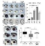 Figure 2. Retinol binding protein 1 is necessary for Xenopus eye development. A, Rbp1 knockdown resulted in microphthalmia (white arrowheads) at stage 42 whereas control morpholino oligonucleotide (MO)-injected eyes were normally developed. The eye phenotype was significantly rescued by co-injecting human Î50UTR RBP1 RNA. Statistical evaluation showed a dose-dependent eye phenotype upon injection of retinol binding protein 1 (Rbp1) MO. Scale bars: dorsal, 300 μm; lateral, 500 μm; detail, 150 μm; and section, 100 μm. B, Measurement of the eye area (red dotted circles) at stage 42. All individual embryos from one experiment (batch) with a representative phenotype were evaluated. Rbp1 MO-injected embryos had significantly smaller eye areas than control MO-injected embryos. The phenotype was significantly rescued by co-injecting 50 ng Rbp1 MO plus 0.5 ng full-length human Î50UTR RBP1 RNA. Scale bar: 300 μm. Abbreviations: CoMo, control MO; inj., injected; MO, morpholino oligonucleotide; N, number of evaluated embryos in total; n, number of independent experiments; ng, nanogram; Rbp1, retinol binding protein 1; RPE, retinal pigmented epithelium; uninj., uninjected. Statistics: Error bars show SEM; * P ⤠.05; **P ⤠.01; ***P ⤠.001; ****P ⤠.0001. P values were calculated by a non-parametric, one-tailed Mann- Whitney rank sum test |