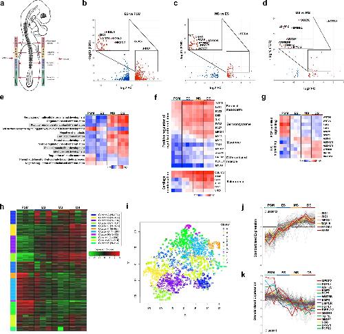 Fig. 1: Transcriptional profiling of developing somites. a Schematic representation of HH14 chick embryo with presomitic mesoderm (PSM), epithelial somite (ES), maturing somite (MS) and differentiated somite (DS) dissected for RNA-seq and ATAC-seq, in triplicate. bâd Volcano plots showing enriched genes (log fold change >1.5) comparing PSM with ES, ES with MS, and MS with DS. e Heat map showing GO terms associated with PSM or DS enriched genes. f Clusters of highly correlated genes identified for myoblast differentiation and cartilage condensation. g Wnt, FGF and retinoic acid (RA) signalling pathways are shown in heat map. h Heat map showing k-means linear enrichment clustering across PSM, ES, MS and DS. i Dimension reduction algorithm t-SNE used to map top genes in each cluster determined by k-means. j Cluster B and k Cluster I are shown with some genes labelled to identify key transcription factors and signalling components. |