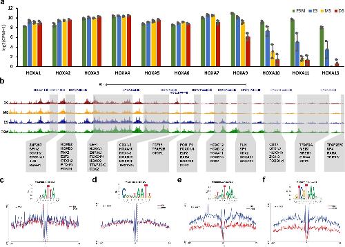 Fig. 4: Chromatin accessibility and differential footprints for HoxA cluster. a Gene expression from mRNA-seq for HoxA cluster (error barsâ=âSEM, nâ=â3) in paraxial mesoderm regions. b Genome browser views of ATAC-seq profile across the HoxA cluster. ATAC and RNA profiles are shown in green for PSM, in blue for ES, in yellow for MS and in red for DS. Grey boxes indicate intergenic accessible regions and transcription factor footprints identified within those regions. Genome-wide differential footprinting for (c) HoxA2, (d) HoxA5, (e) HoxA10 and (f) HoxA11 between PSM and DS. |
