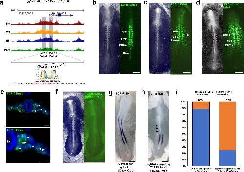 Fig. 5: Identification of a regulatory element for TCF15. a ATAC-seq profile at the TCF15 locus. Grey boxes indicate putative enhancers identified (TCF15 Enh-1 and TCF15 Enh-2). RARA footprint identified within TCF15 Enh-2. Mutant reporter sequence for TCF15 Enh-2 RARA mutant. b TCF15 Enh-1 (nâ=â15/15) and c TCF15 Enh-2 (nâ=â9/9) reporter expression in presomitic mesoderm (Psm), notochord (Nc), somites (So) and lateral plate mesoderm (Lpm). d Combined TCF15 Enh-1/Enh-2 reporter expression (nâ=â9/9). e Transverse sections of embryo in c immunostained for Citrine showing TCF15 Enh-2 expression in somites and lateral plate mesoderm, white dashed line in c indicates location of section, representative of (nâ=â4/4). Nuclei stained with DAPI (blue). f TCF15 Enh-2 Citrine reporter with RARA binding site mutation displays lack of expression in somites (nâ=â6/6). Epigenome engineering using dCas9-Krab with (g) control scrambled sgRNAs resulted in no change (nâ=â8/9) and (h) sgRNAs targeting endogenous RARA binding site led to loss of TCF15 expression (nâ=â6/8) as shown by wholemount in situ hybridisation. i Percentage of embryos with normal (blue) or reduced (orange) TCF15 in situ expression after electroporation of control scrambled sgRNA with dCas9-Krab or sgRNAs targeting TCF15 Enh-2 RARA binding site with dCas9-Krab. All scale barsâ=â500âμm except for e scale barâ=â100âμm. |