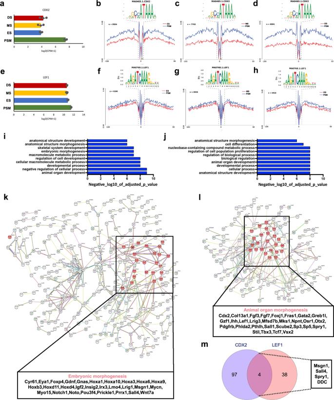 Fig. 3: Differential footprints identified for CDX2 and LEF1 during somite development a Gene expression from mRNA-seq (error barsâ=âSEM, nâ=â3) for CDX2. b Tn5 insertion frequency across all accessible regions containing at least one CDX2 motif, at nucleotide resolution in PSM, ES, MS and DS reveals the presence of a footprint centred on the CDX2 motif. Differential footprinting for CDX2 motif comparing PSM and ES, c PSM and MS, and d PSM and DS. e Gene expression for LEF1 (error barsâ=âSEM, nâ=â3). f Differential footprinting for LEF1 motif comparing PSM and ES, g PSM and MS, and h PSM and DS. Similar GO terms for genes associated with (i) CDX2 footprints and (j) LEF1 footprints. For enriched GO terms, p values were obtained from a modified Fisher exact test. k, l Proteinâprotein network analysis using STRING database. Interactions between genes identified with (k) CDX2 and (l) LEF1 footprints in an accessible region, within 10âkb upstream or downstream. Highlighted in red are genes correlated with embryonic morphogenesis in CDX2-associated genes and animal organ morphogenesis in LEF1-associated genes. m Venn diagram of CDX2-associated genes against LEF1-associated genes identified only four common genesâMsgn1, Sall4, Spry1 and DDC. |